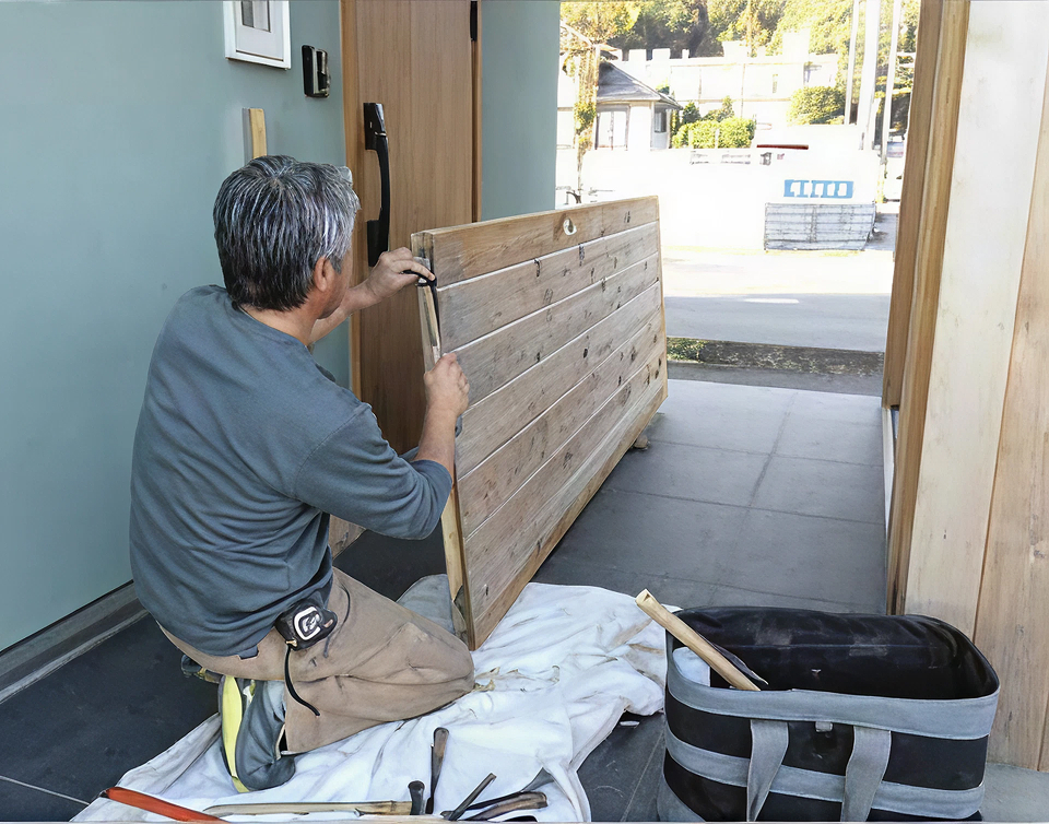 外部という条件柄、雨や湿気で保湿と乾燥を繰り返すうちに、表面が無垢材の引き戸が開けにくくなりました。