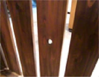 杉板の死に節です。節が経年で抜け落ちてしまいました。(節なしもありますがコストがとても高くつきます) 下地に貼る場合は抜け落ちることはありませんが、板材にする場合は注意が必要だと感じました。 *このケースは特にクレームを頂いたわけではありませんが、食事に立ち寄った時に少し気になって・・・ 気にする方もいるのかもしれないなーと思い記事にしておきたいと思いました。無垢の木の味だと捉える方もみえます。 施工時にある程度の選別は可能なので次回からは気にして施工にあたりたいと思います。