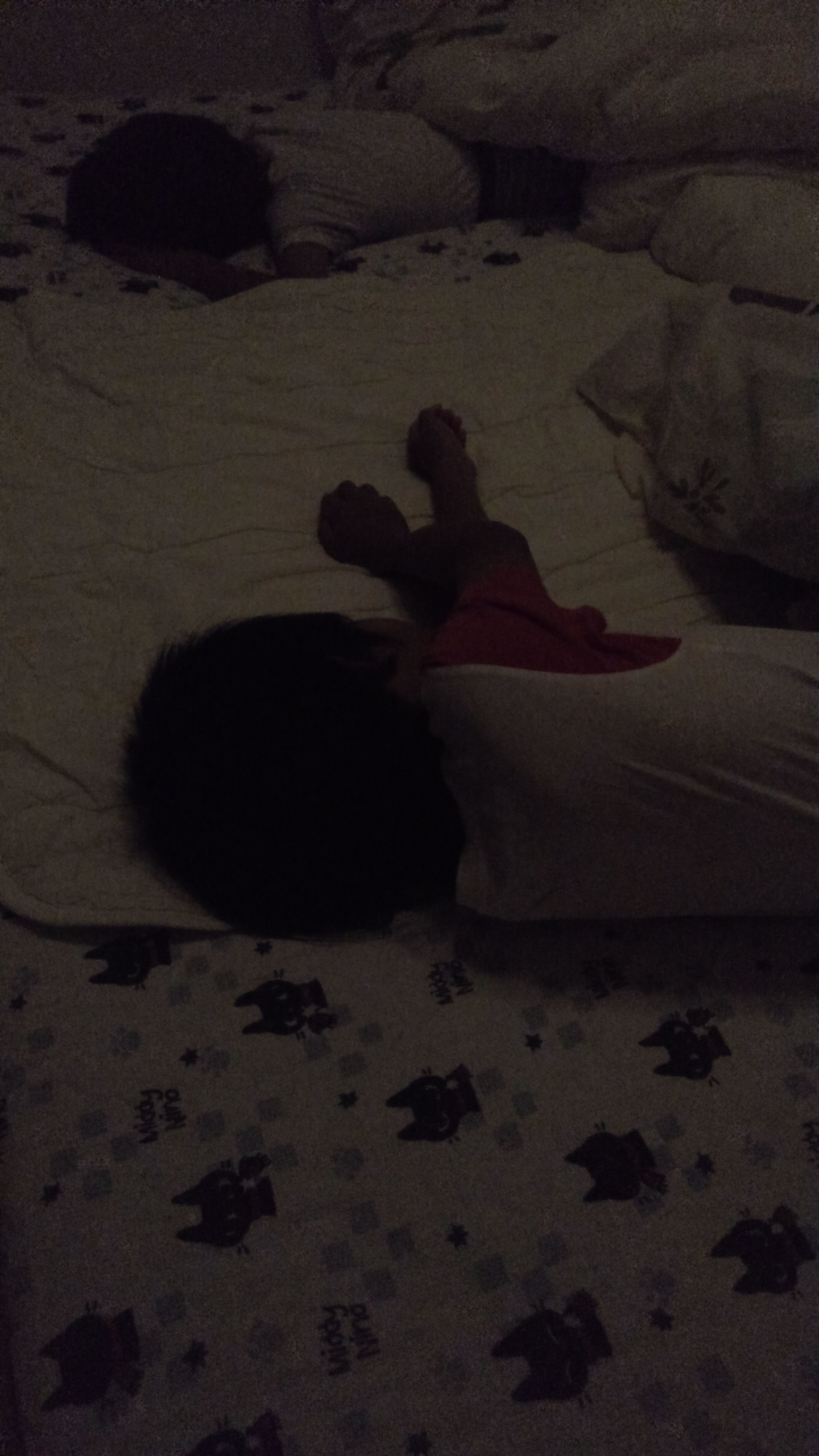 子供たちの寝ているとこを写真撮ってみました。布団はかけていますが、パジャマは半袖です。