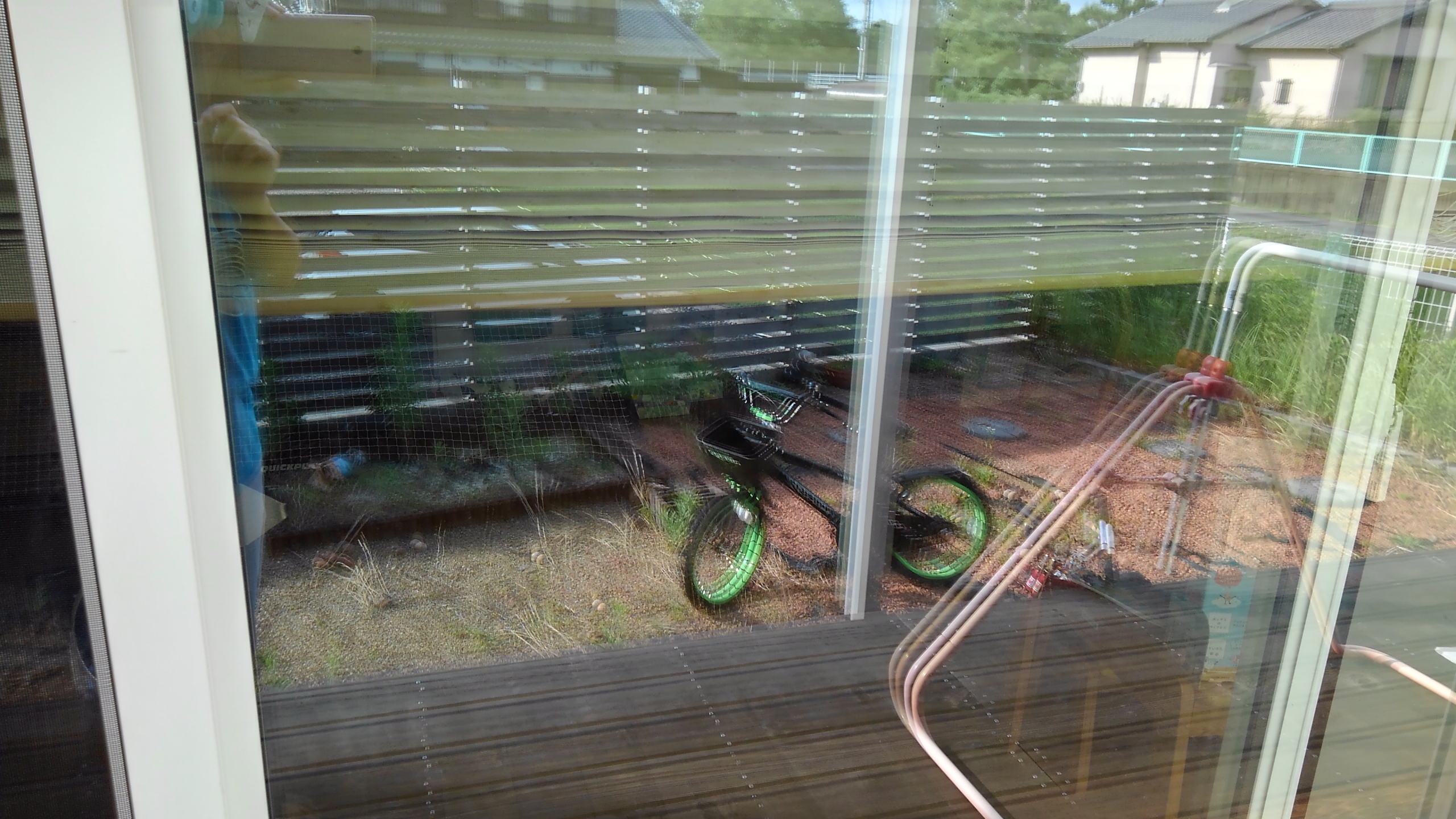 昼間の明るい時間帯のせいもあるかもしれないですが、鏡の窓のように反射して外の景色が移って、中の様子はほとんどわかりません。