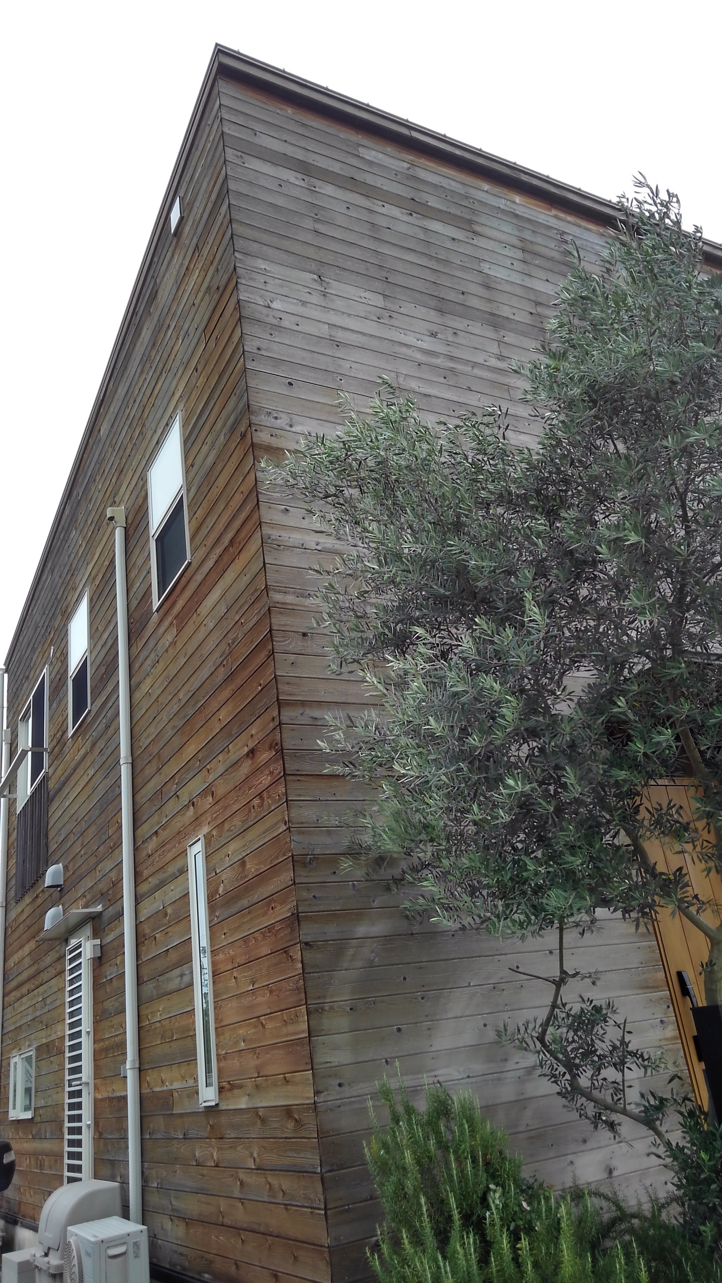 ずっと雨に濡れていたエムズさんの木の家は今日1日の日差しですっかり乾き、色はちょっとグレーがかったような薄い茶色、渋い感じです(^-^)