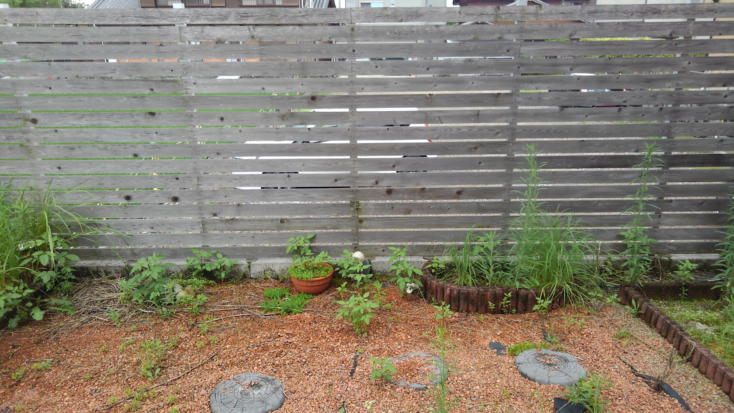 庭にあるエムズさんに取り付けていただいた木のフェンス、午前中のどしゃ降りでかなり濡れていましたが、午後からの数時間の晴れ間ですっかり乾いてしまいました。