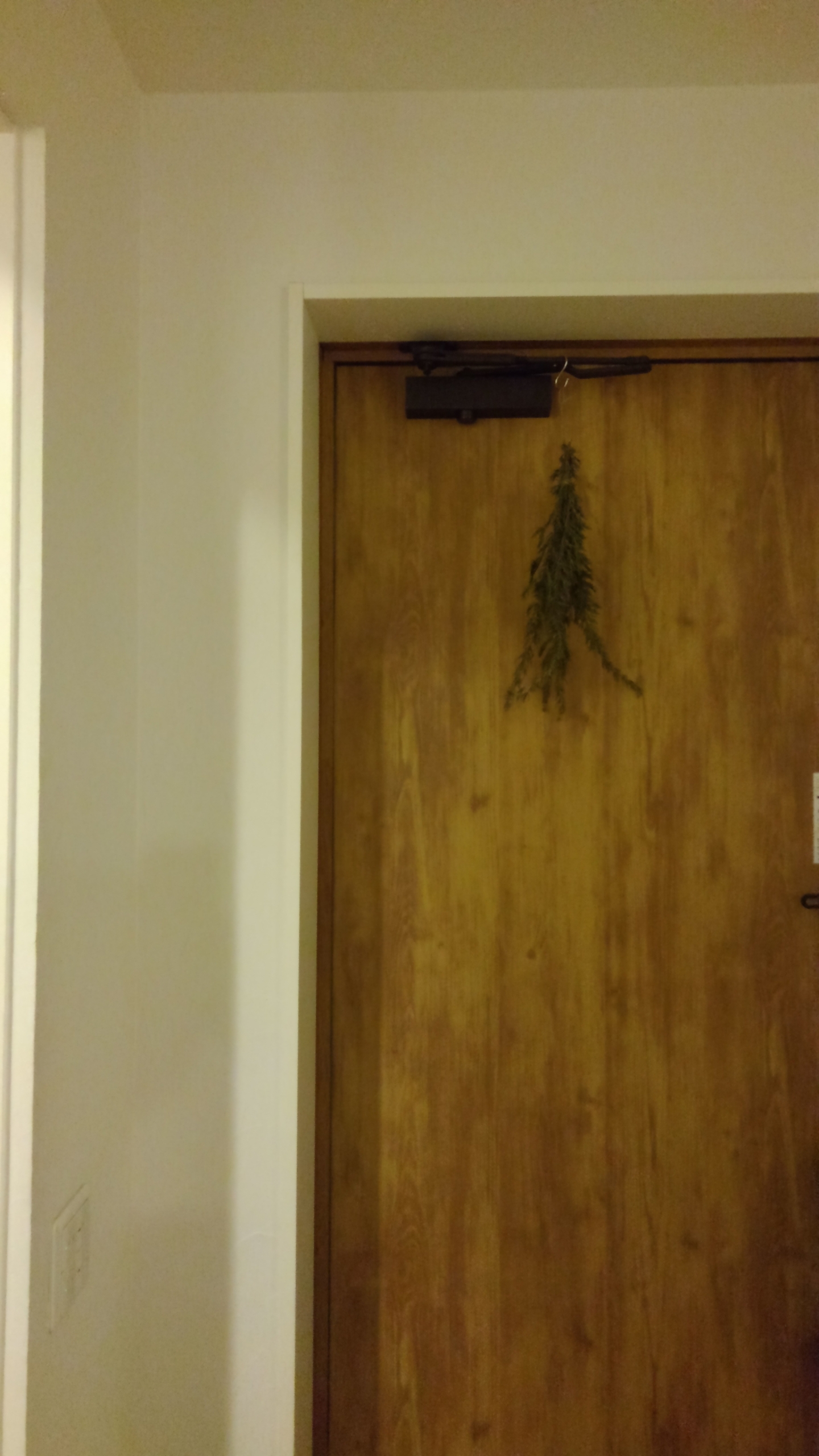 玄関前のオリーブの回りに植えてあるローズマリーを玄関にかけてみました。