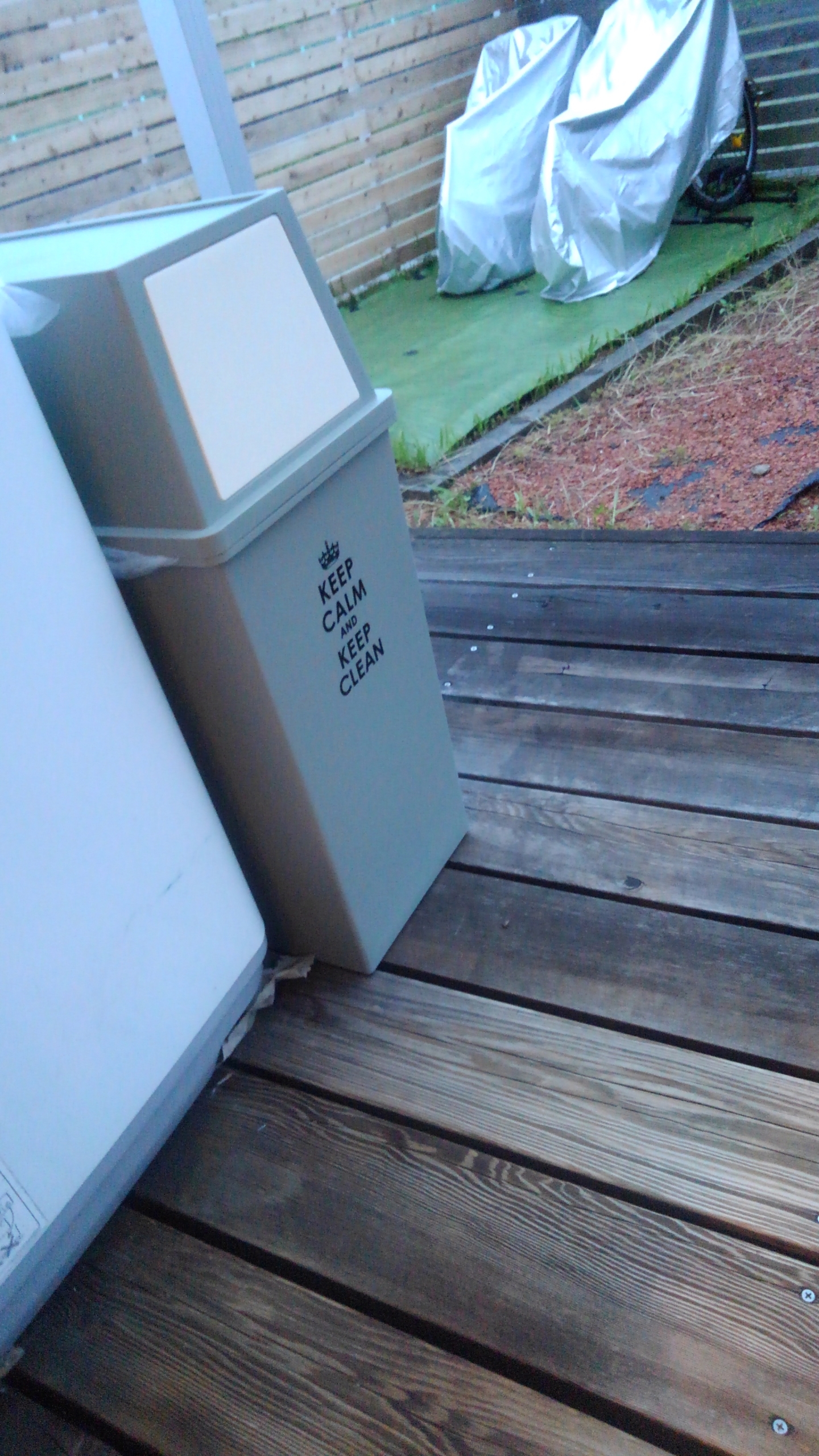 でもキッチンには燃えるゴミ用のゴミ箱がおいてあるので、2つ並べて使うと場所をとってしまうので、どうしようかと考えて、ウッドデッキに置いてみることにしました。