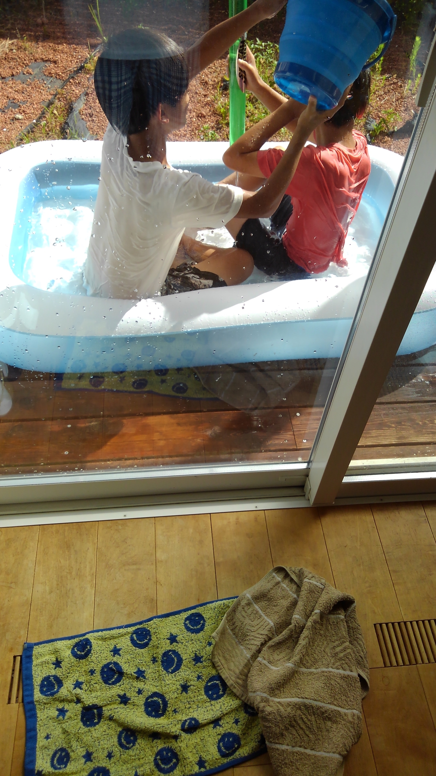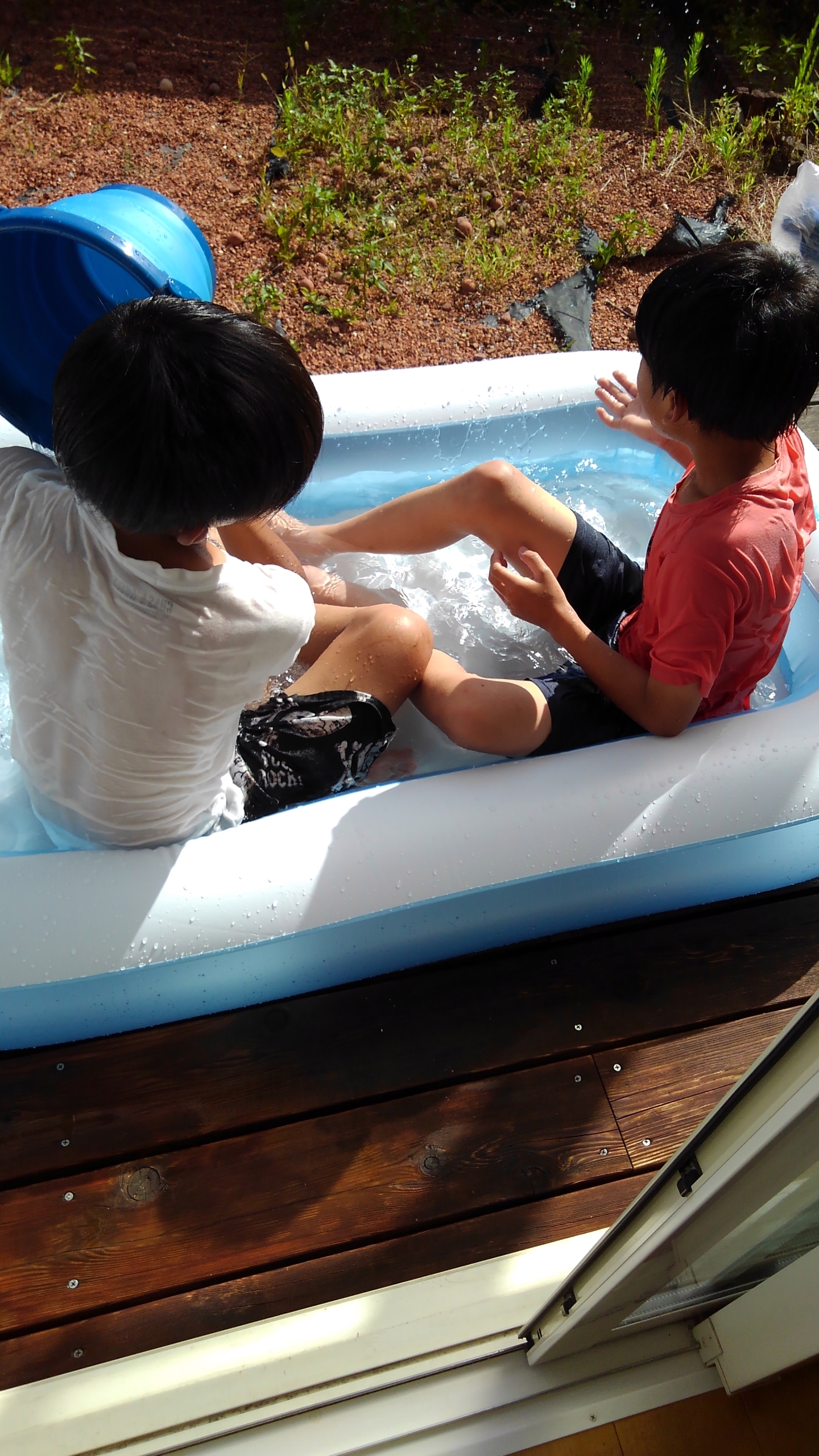 以前にウッドデッキの片付けをして、結構広々したので、のびのび水遊びできました。
