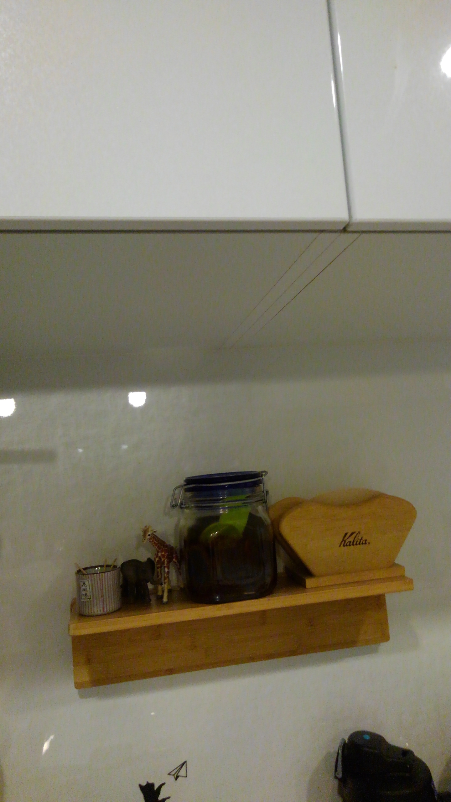 数年前にエムズさんにお願いして、取り付けていただいたお店で購入した棚ですが、エムズさんのご提案で穴を開けて取り付けするよりも、もしも要らなくなった時に壁が綺麗なままのように、強力な両面テープでつけた方がいいということで取り付けていただいたものですが、コーヒー豆など、結構重たい物を乗せてあるのですが、いまだに一度も取れることなくしっかりとついています。