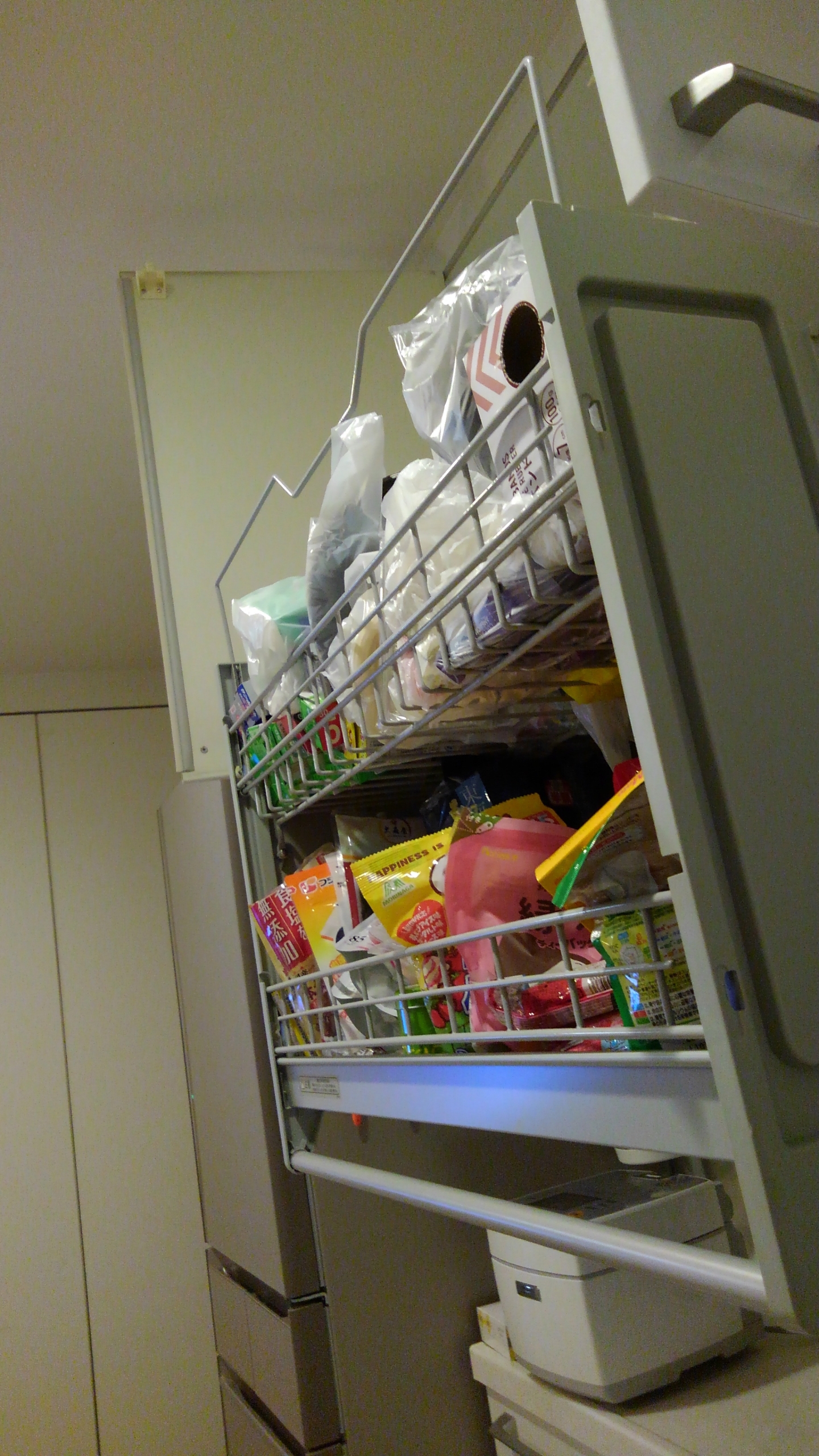 食品類がストックしてあるこの棚は、毎日、何回もキッチンで使用するところなので、手動で中の棚の上げ下ろしができるととても手軽に物をとれ、また収納するときも簡単です。