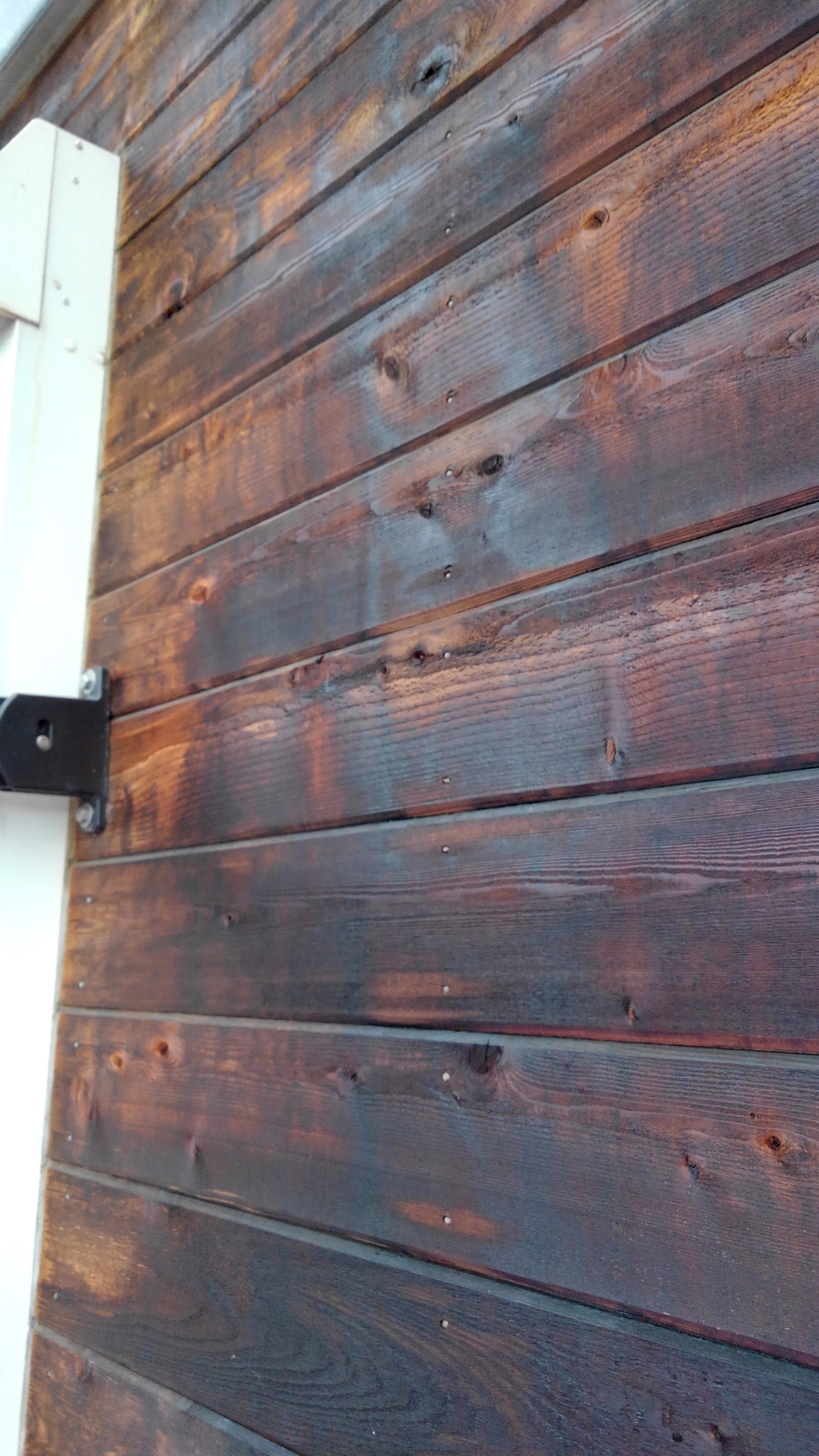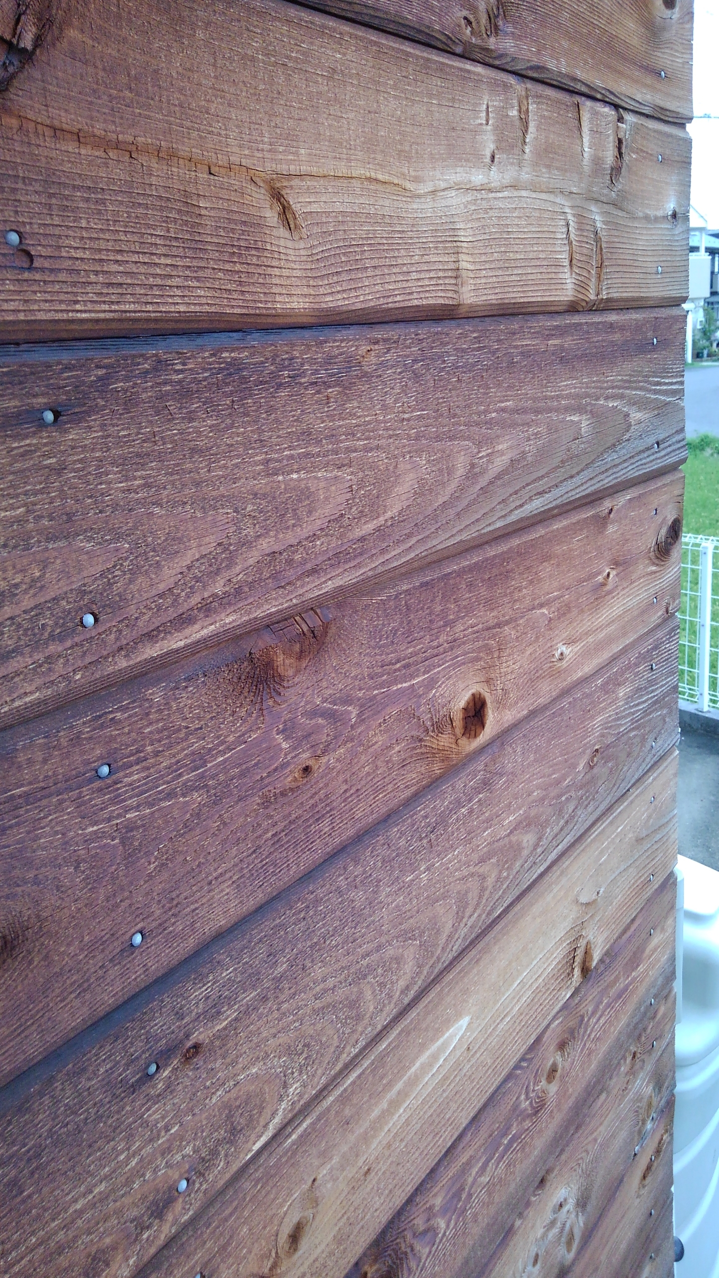 我が家は外壁は一階も二階も木でできていて、木の色が経年で変化してくることを何度かアップしているのですが、南側のちょうど庭の方の木の色が焦げ茶色になってきています。
