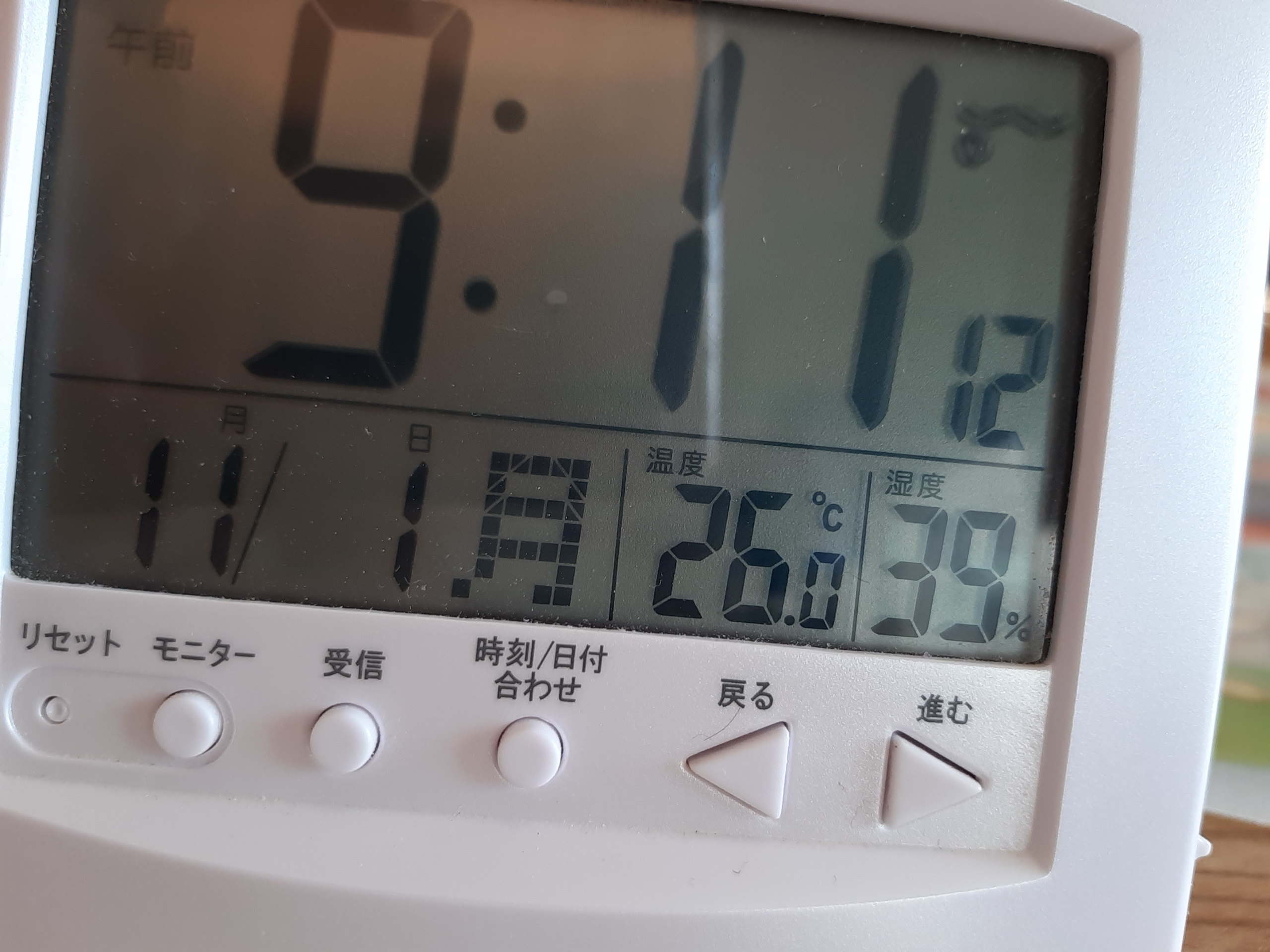 朝まだあまり日差しがないときの部屋の温度を計ってみましたが、26℃あって、部屋の中は全然寒くないです。湿度が少し低いですが、体感的にはまだあまり乾燥を感じないです。