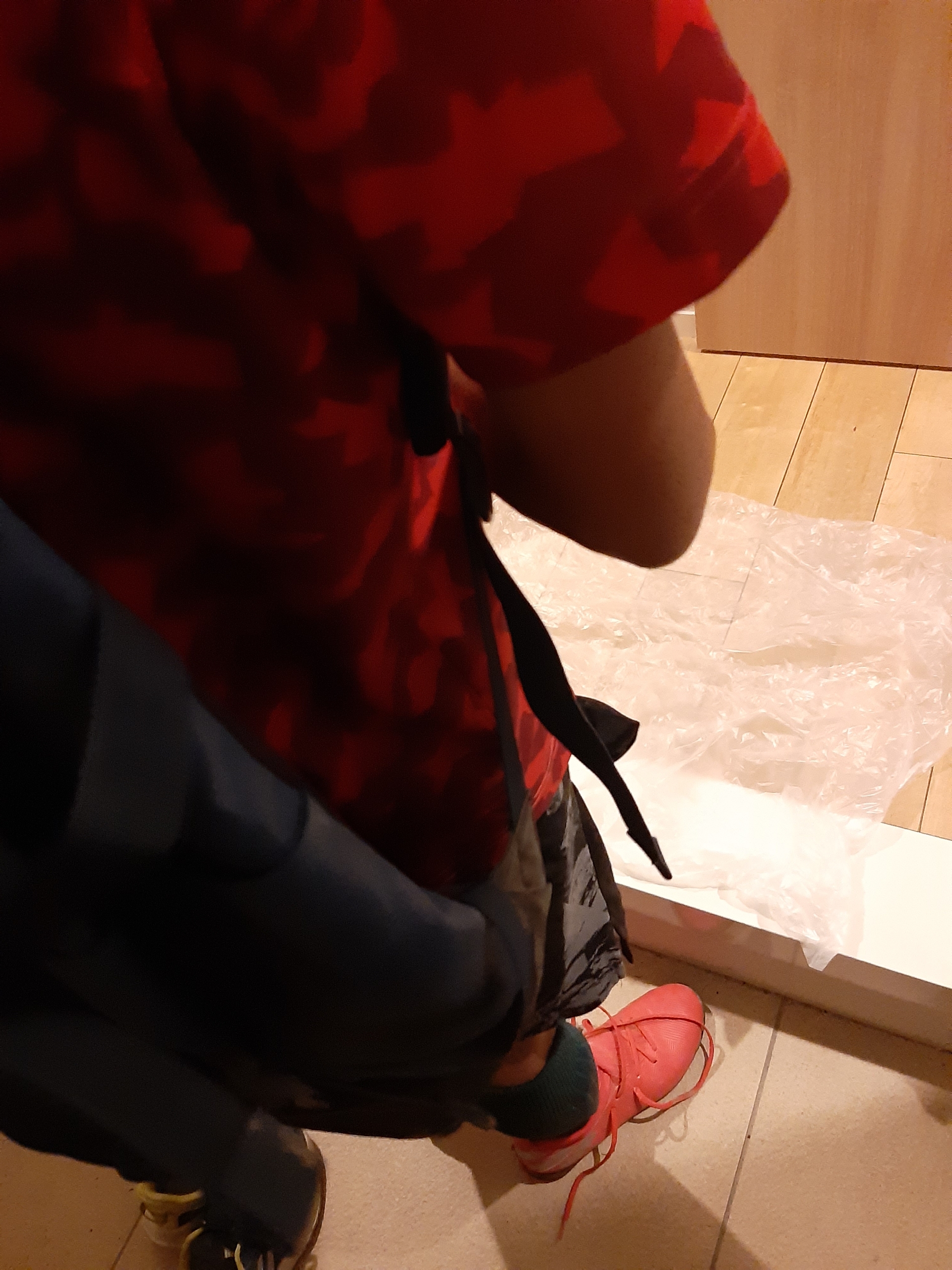 その砂が隙間に入ってしまうと後の掃除がまあまあ大変になってしまうので、サッカーから帰ってきたら玄関にゴミ袋を置いておくようにしてみました。