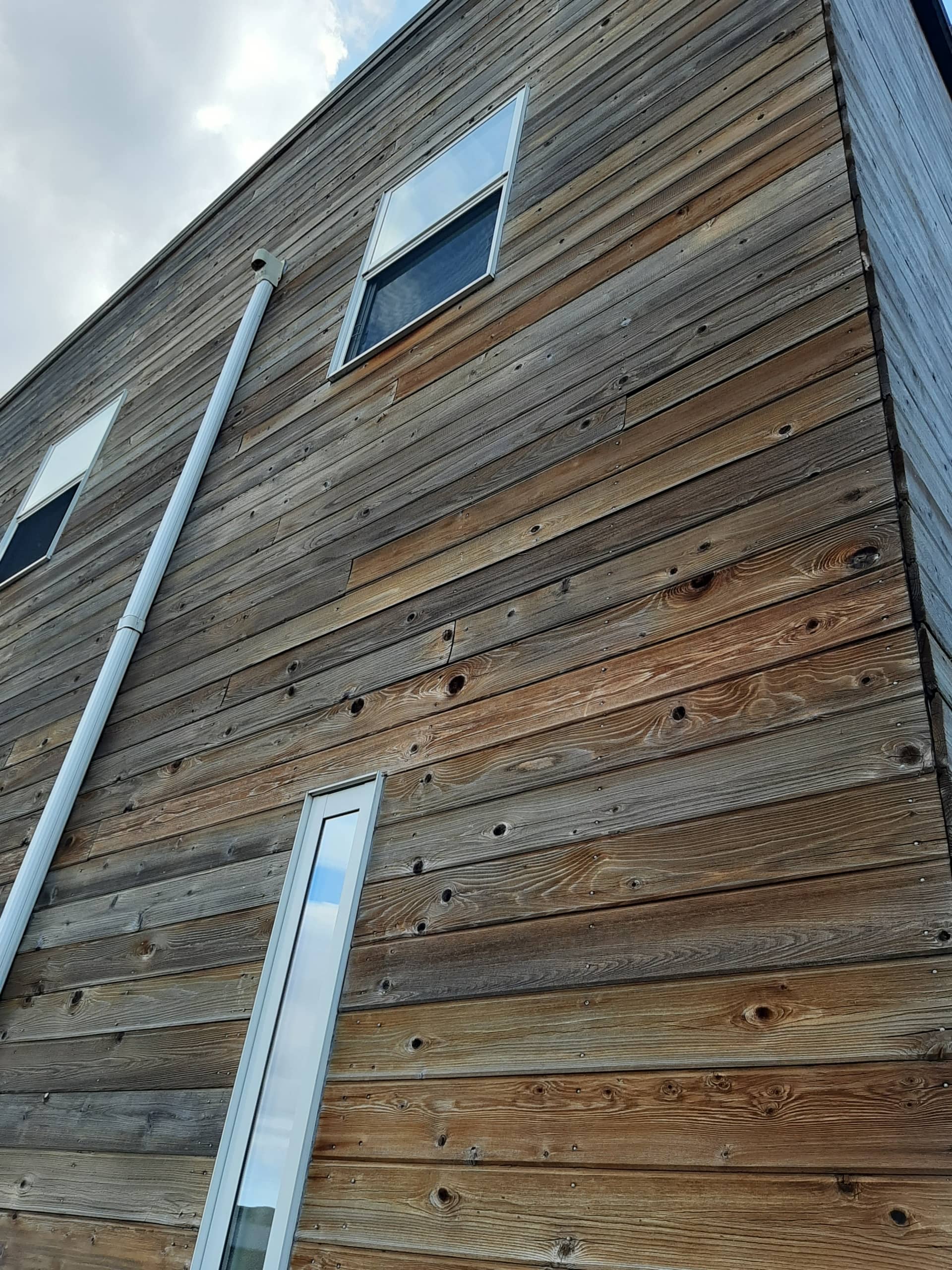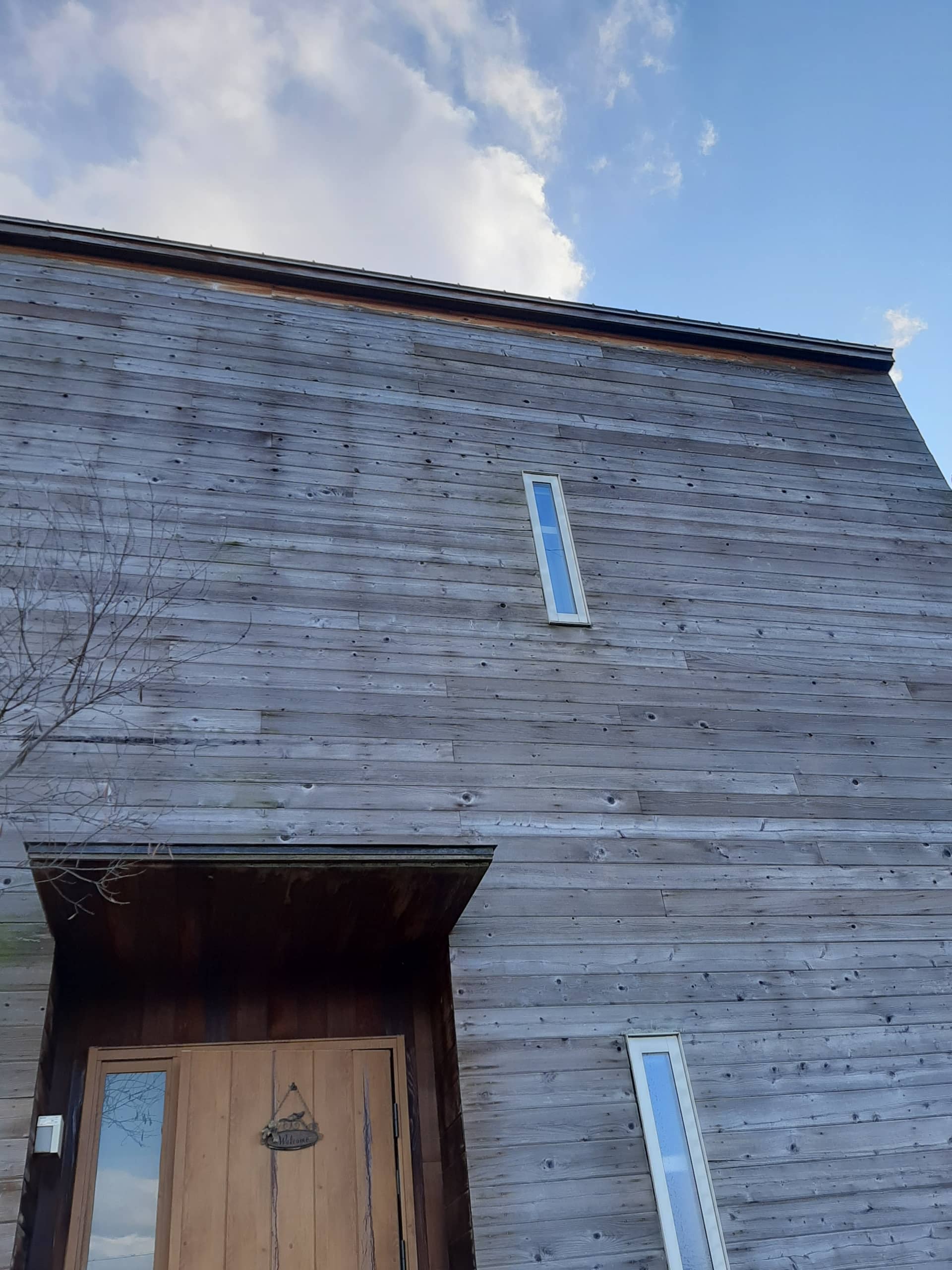 この木の外壁は色の変化があって将来的にシルバーグレーに変わっていくそうなのですが、少しずつシルバーグレーに近づいてきている感じです。