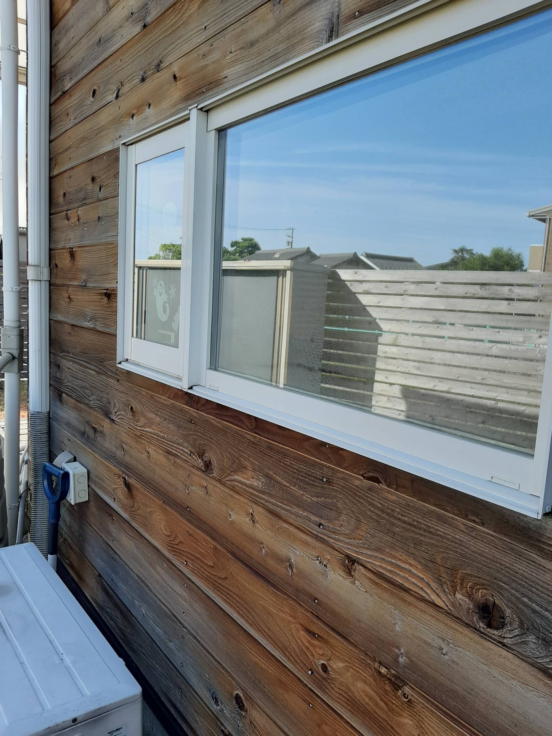 これは東側に面した窓を外から写した写真ですが、見事にマジックミラーのようになって部屋の中が全く見えません(*^^)