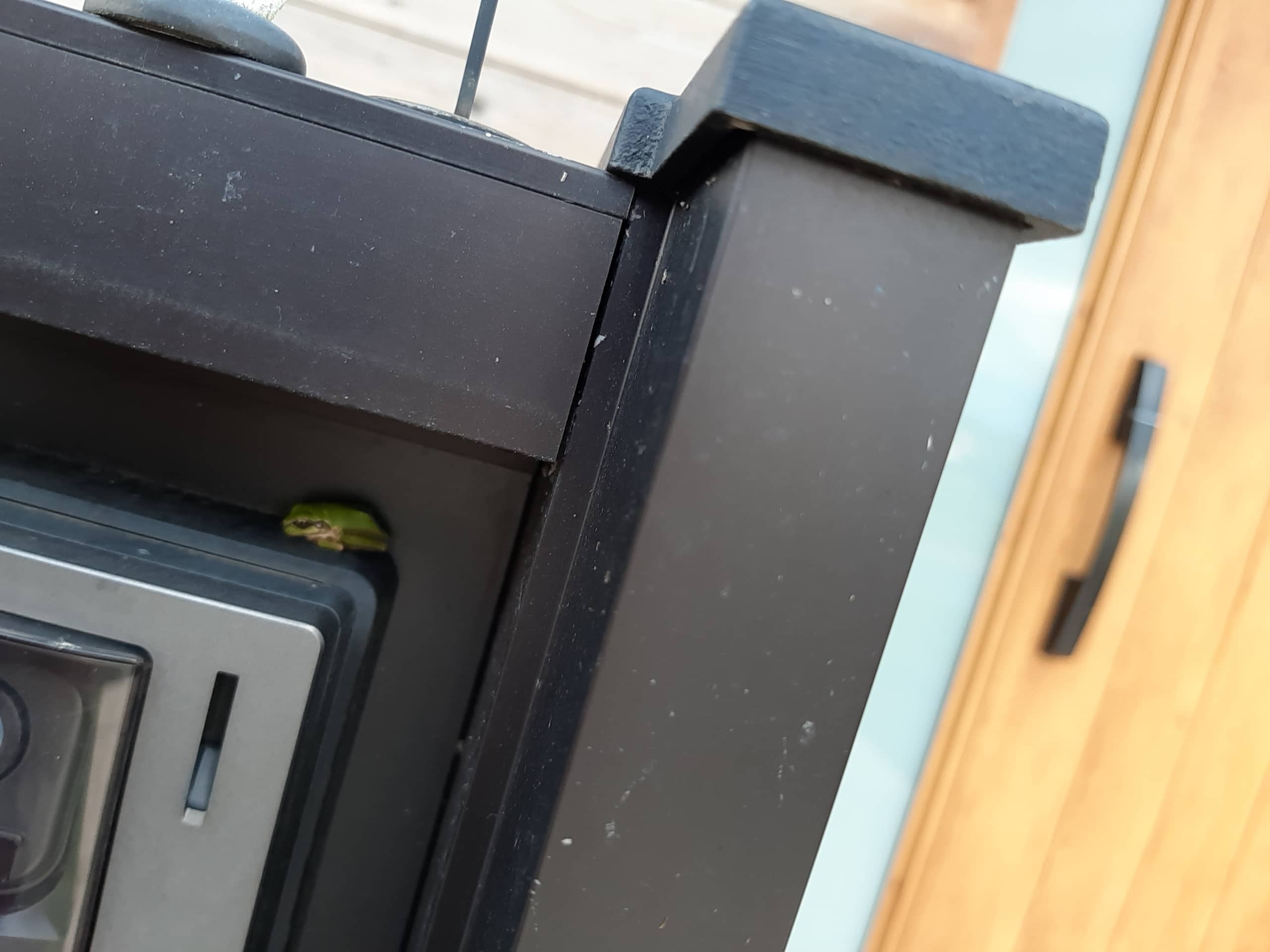 子供が帰ってきた時にポストにカエルが乗ってる!と言うので見に行くと、置物のようにカエルがひと休み?していました。