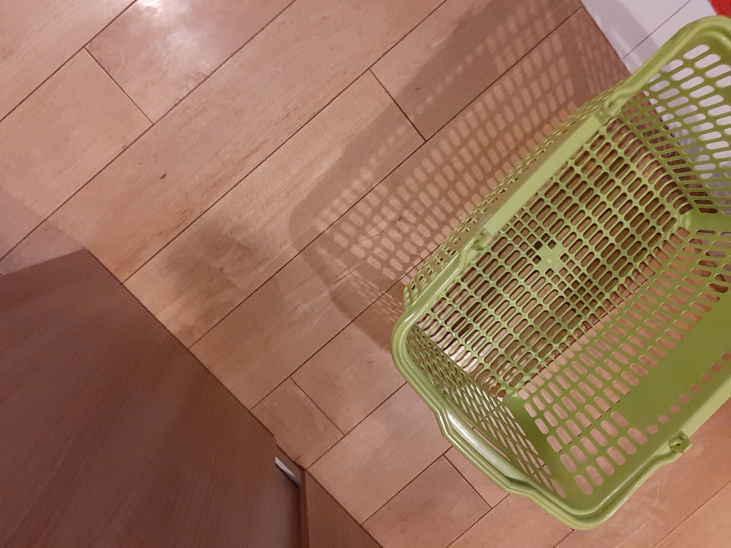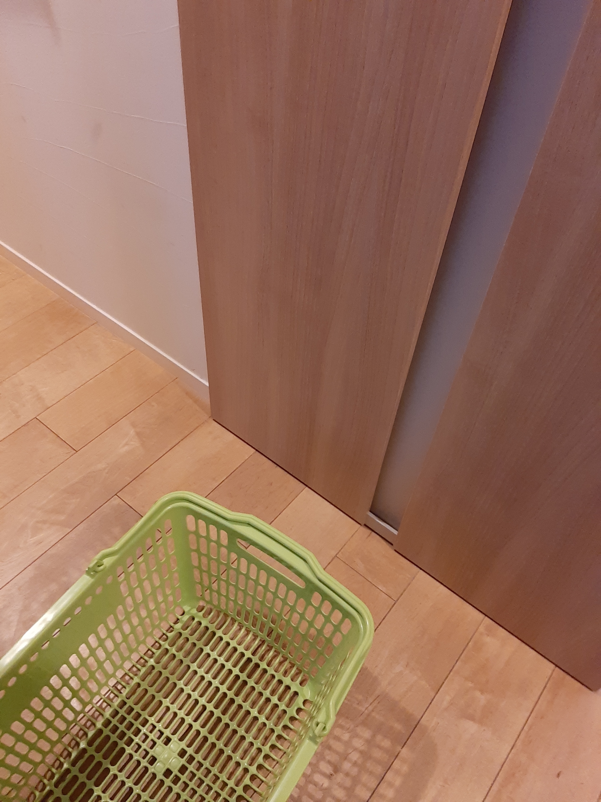 廊下の幅がわかりやすいように買い物カゴを置いてみたのですが、買い物カゴの長さに少しプラスしたくらいの幅なので、子供が同時に帰宅した時は、ちょっとどいて〜とか横にずれて、とかごちゃごちゃになってそこに荷物が加わると足の踏み場もない感じになってしまいます。