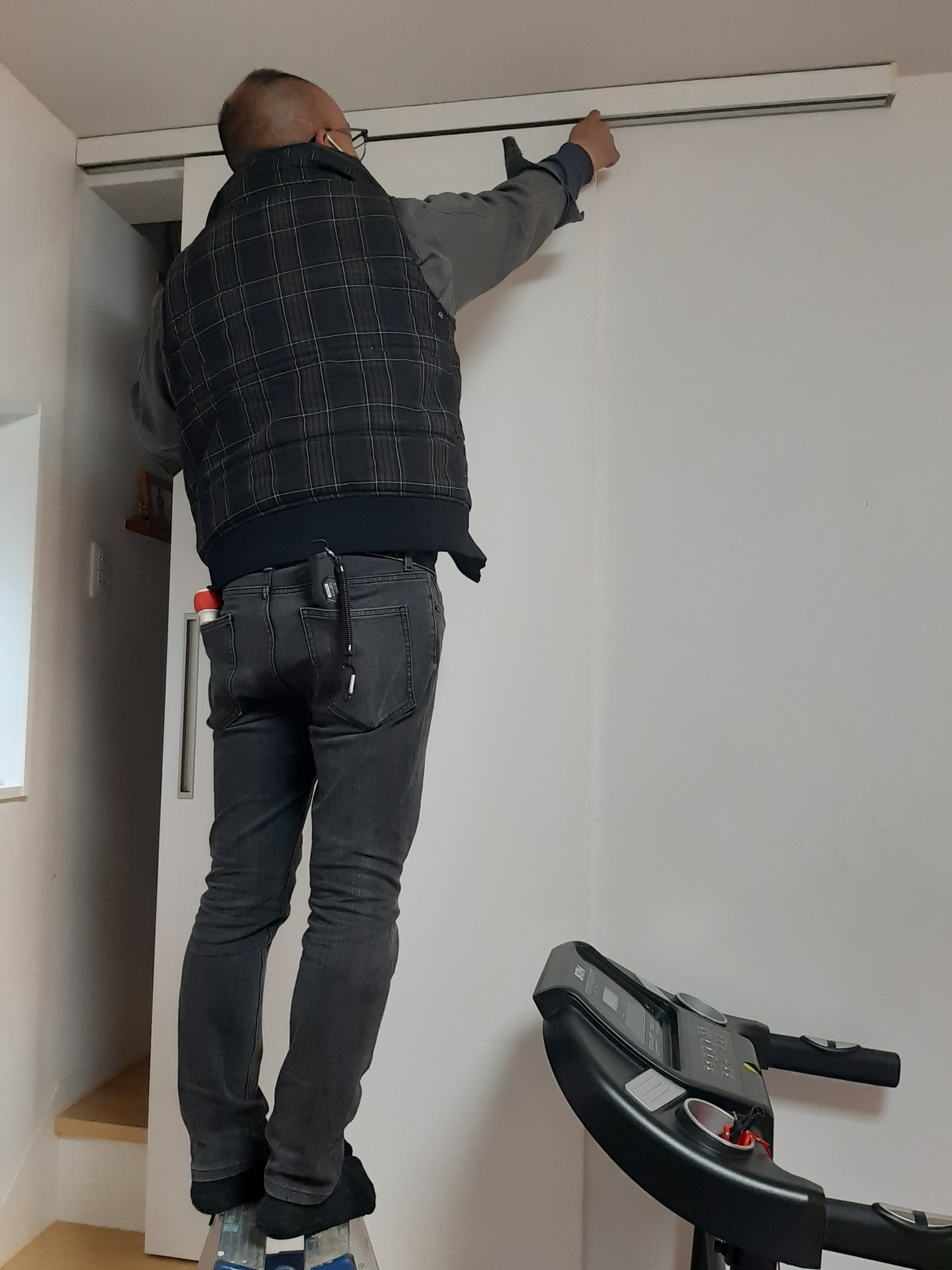 リビングから階段につながる所にあるドアの下の部品が欠けてしまって、エムズさんが修理にきて下さいました。