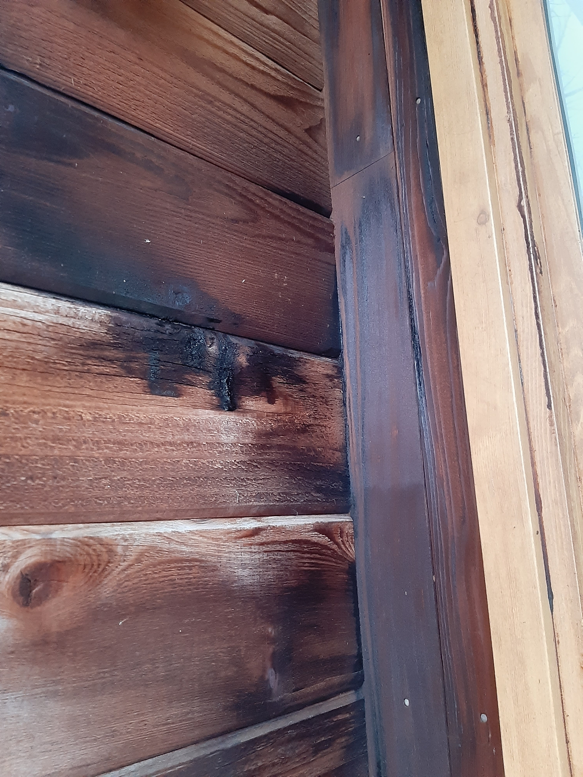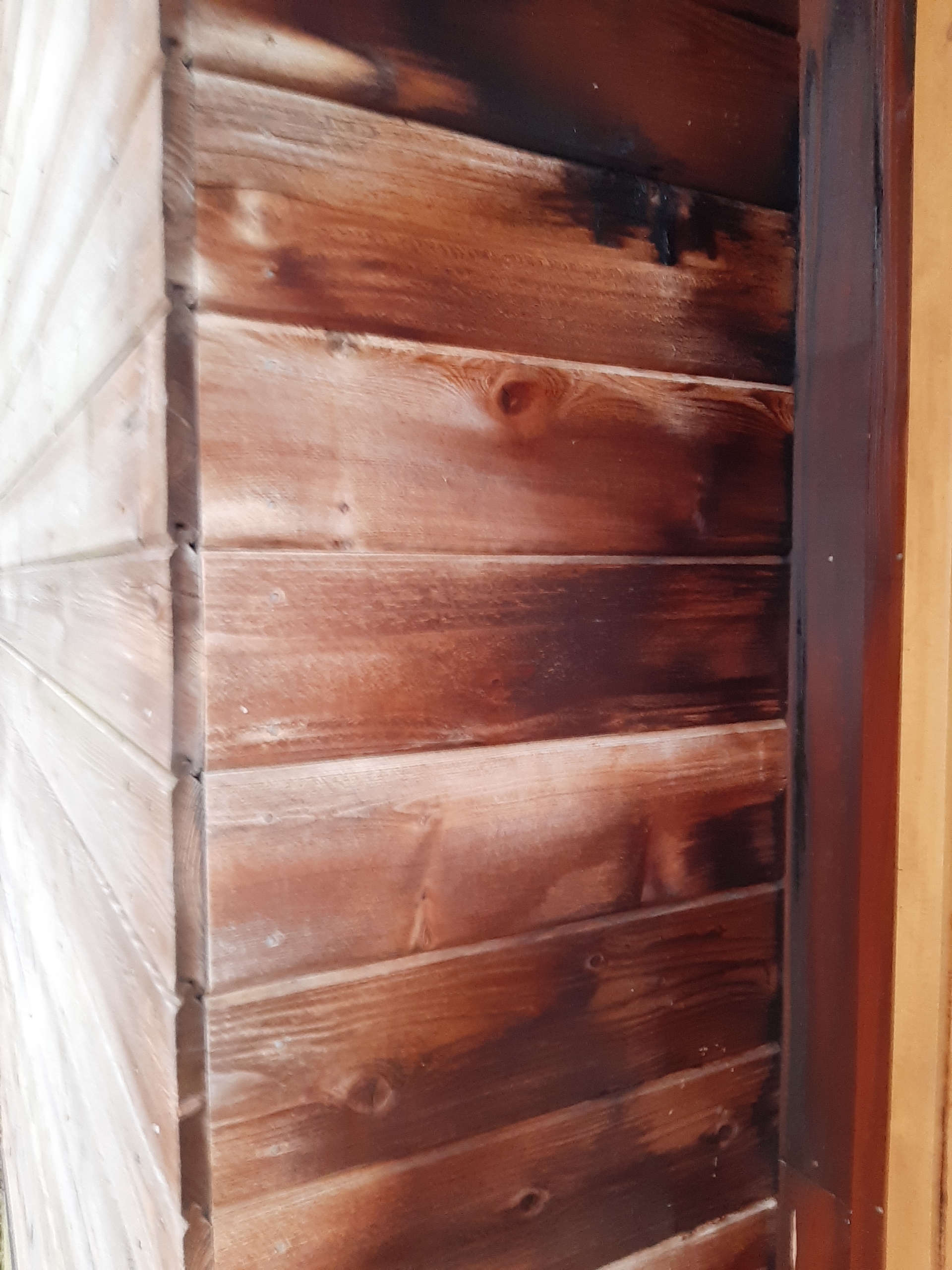 木の外壁なので、そのままだととても燃えやすいので外壁の全てに塗ってあるのですが、少しずつ余分な薬剤が染み出てきては雨が降って流れていく、を繰り返ししているそうなのですが、玄関のドアに近い部分は雨があまり当たらない為、流れていく量が少なくたくさん染み出ている部分があります。