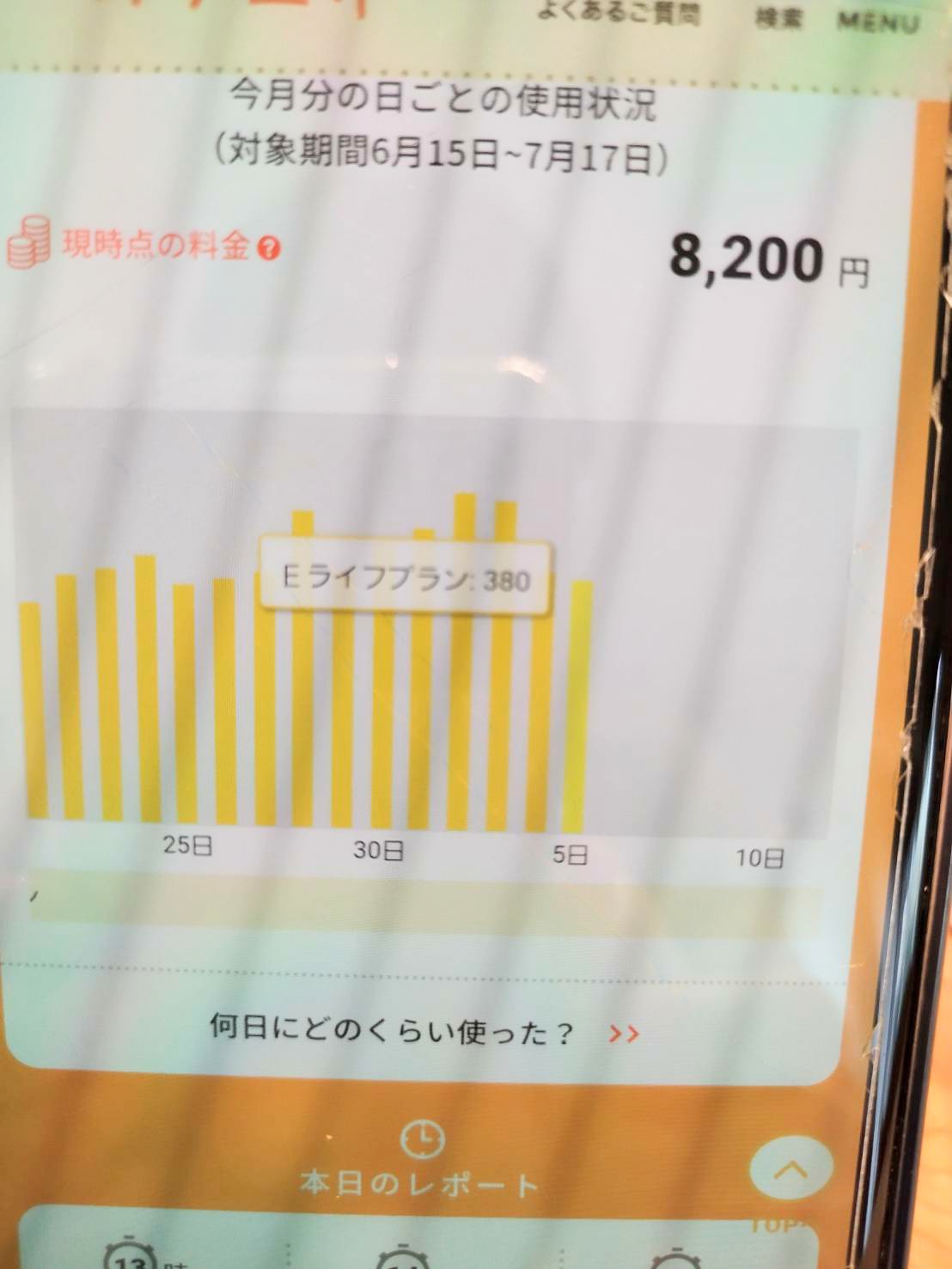 昼間はシャッターを完全に閉めてエアコンをつけず、夜のみ、17時くらいから朝の6時くらいまでつけた時の電気代は、380円でした。