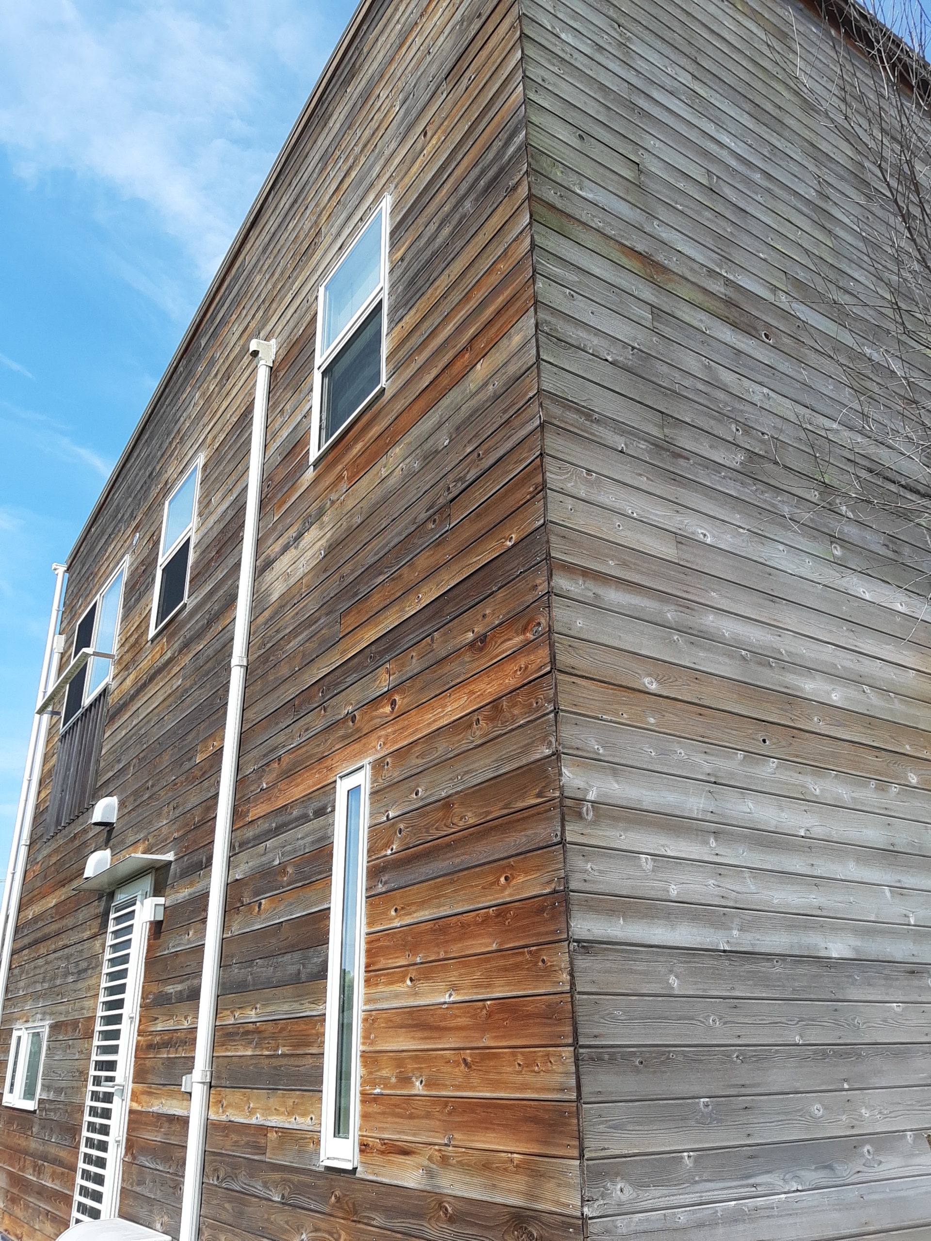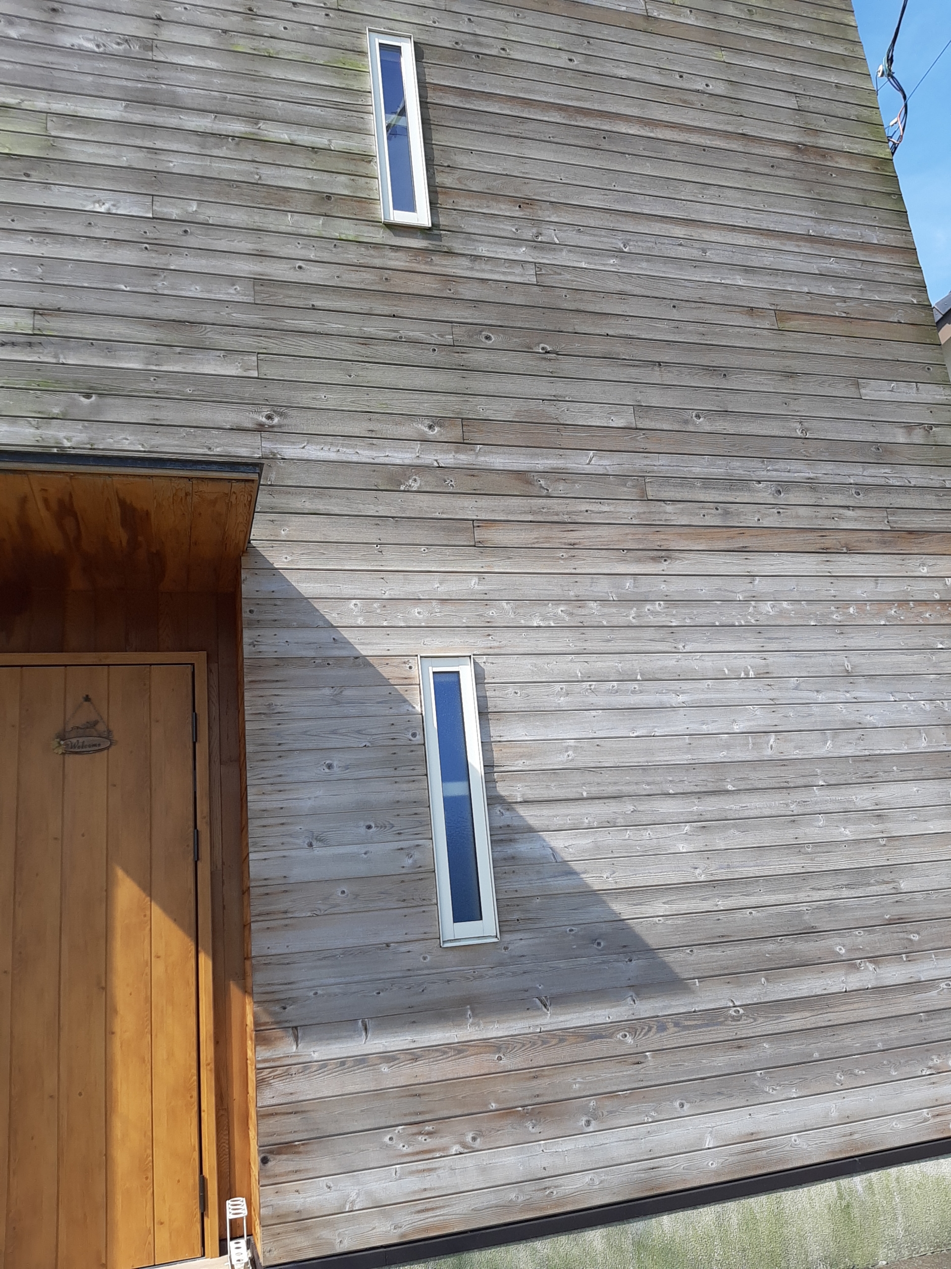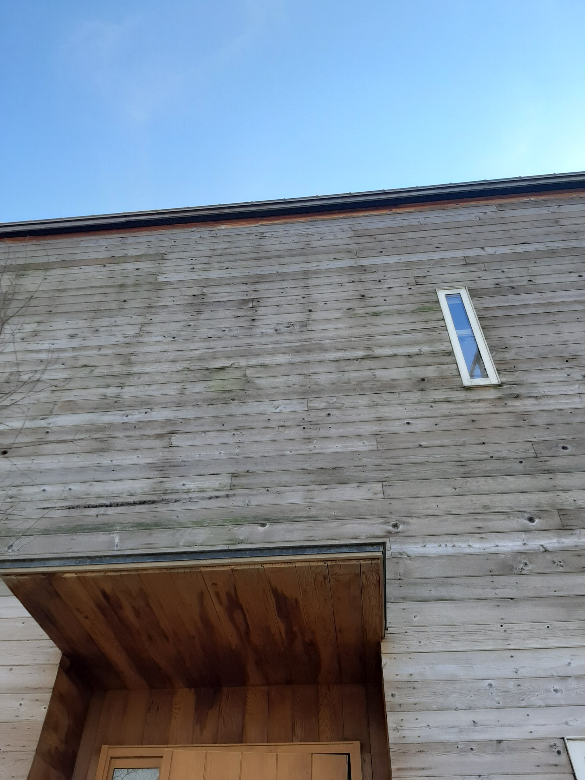 ハシゴを使ってだいぶ高い所まで清掃していただいたのですが、今度は2階部分の手の届かなかった所に苔が生えてきてしまいました。