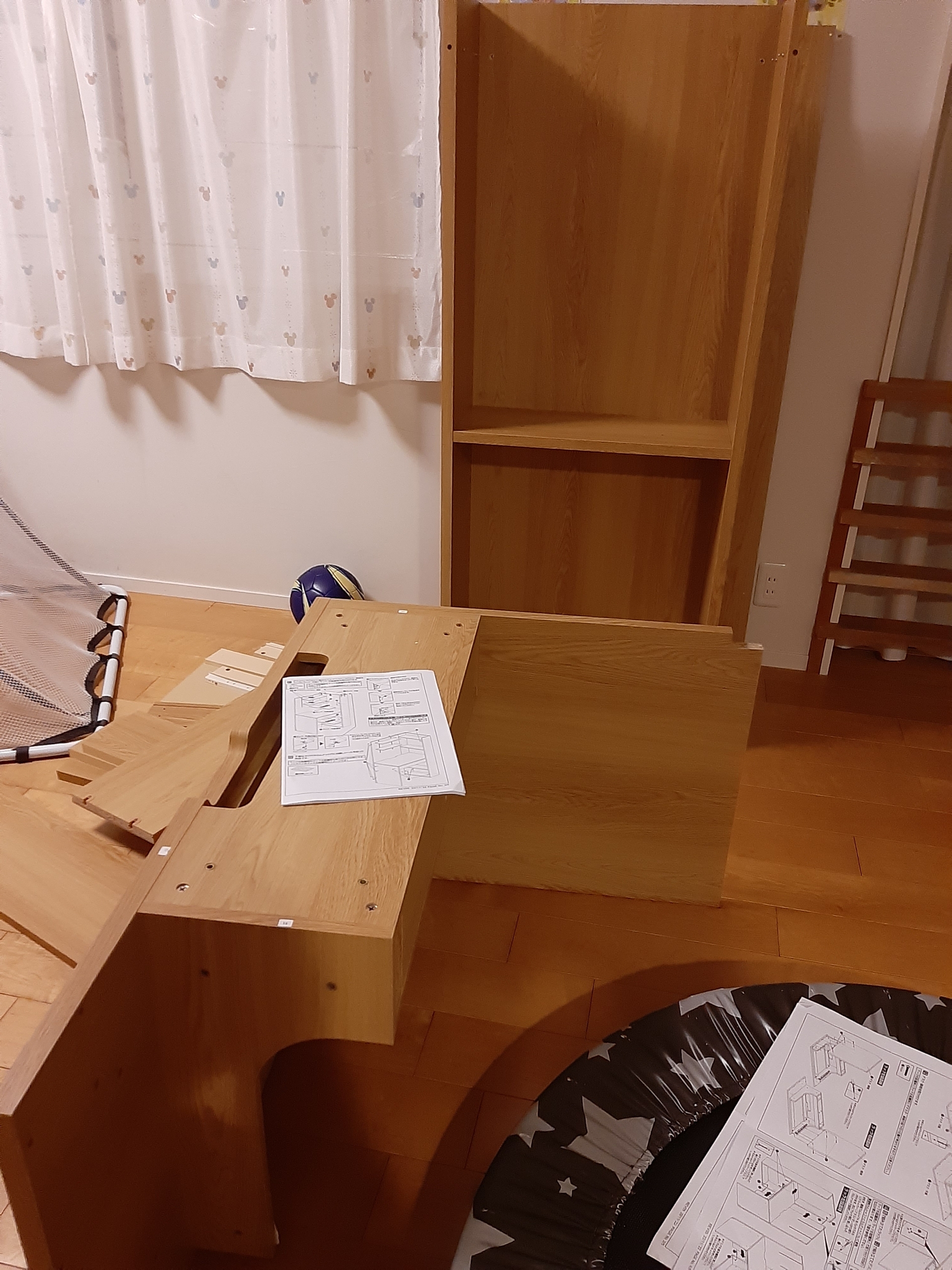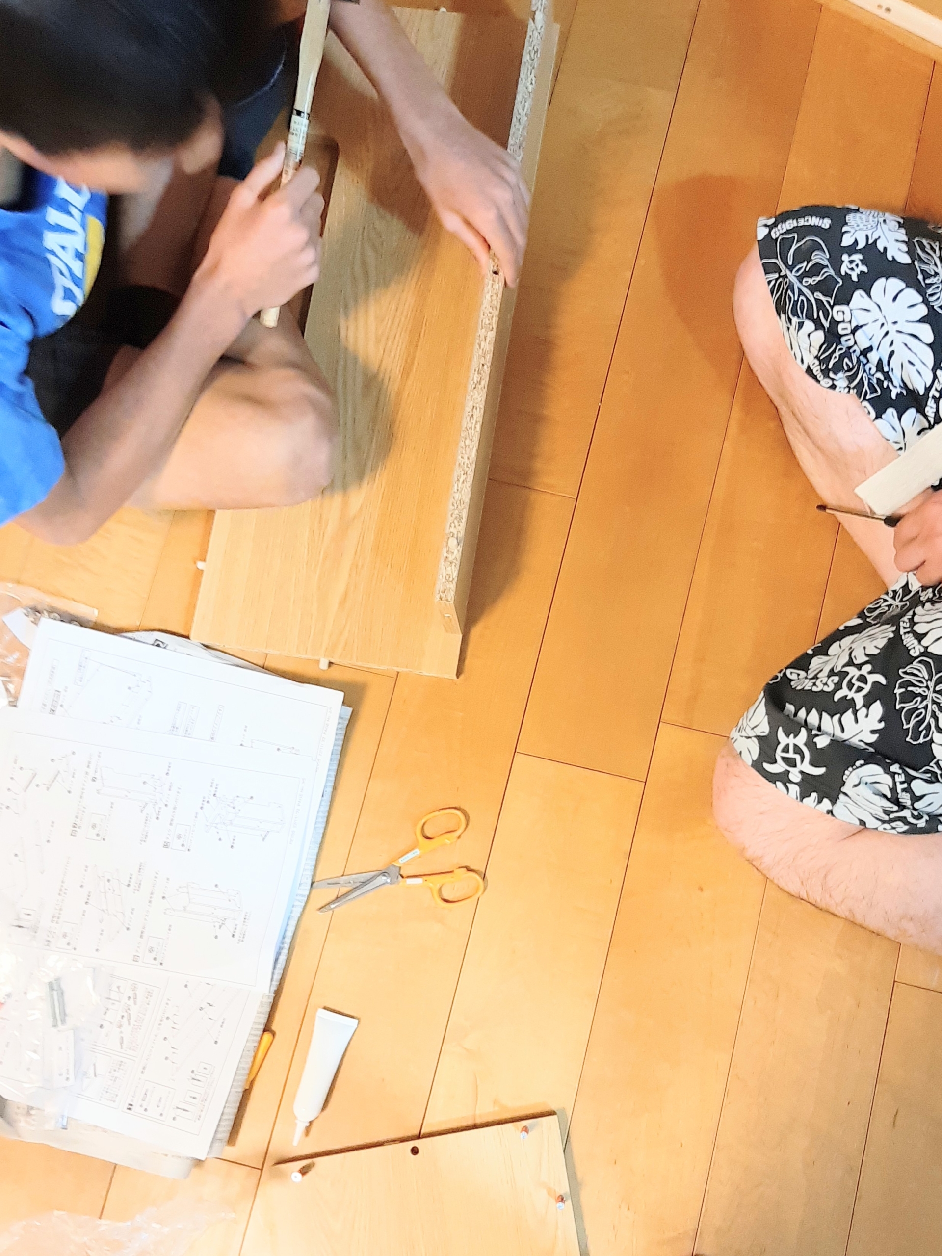 子供部屋の仕切りとして使う予定の机なので長男のようなシンプルな机ではない為、作るのが少し難しいようでやっては外してまたやり直ししたりと苦戦していますが、壊すことが常習犯の次男さん、自分で作った机を大切に使ってくれることを願っています。