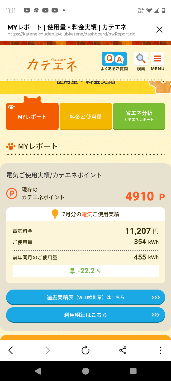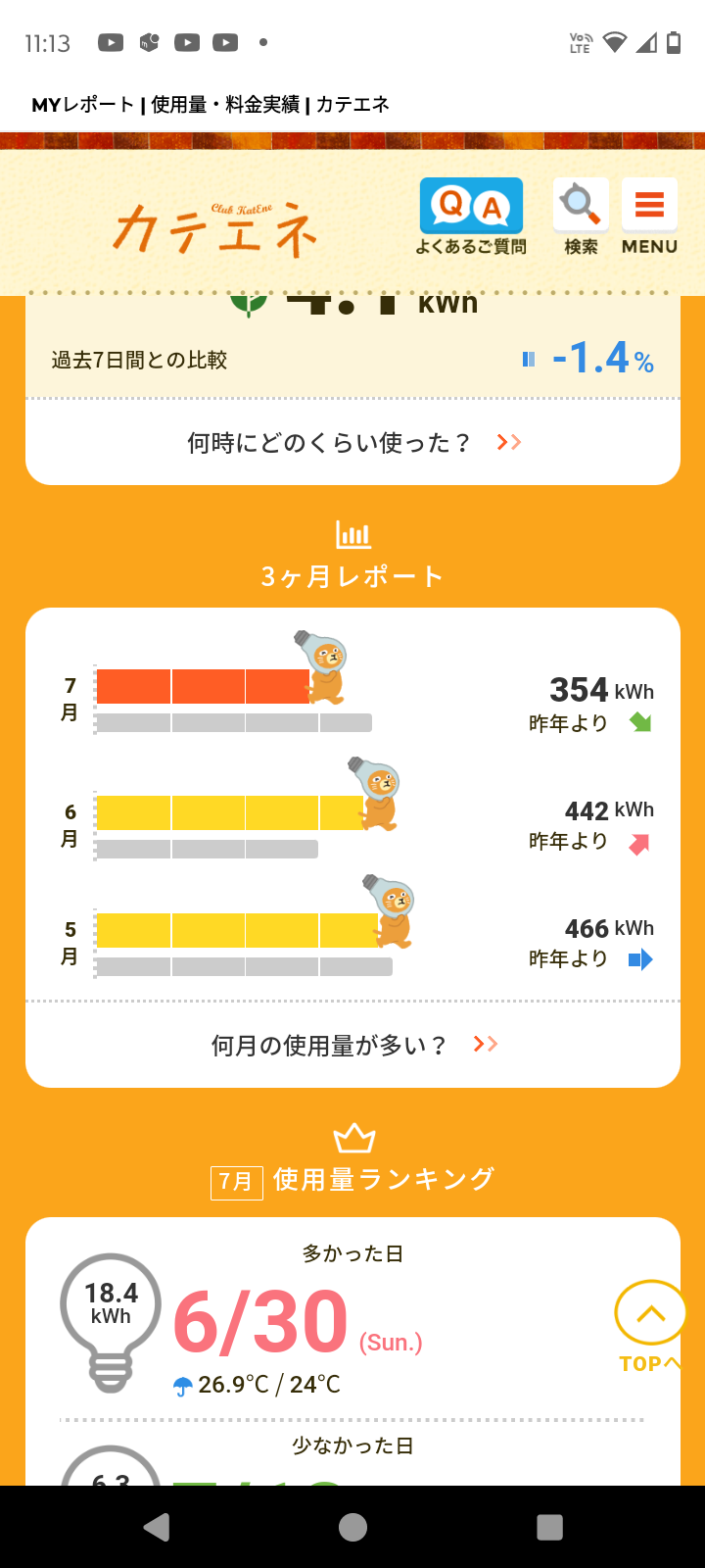 去年の同じ月の7月の電気代より354w減っているので途中からとはいえ、だいぶ減っているなという印象です。