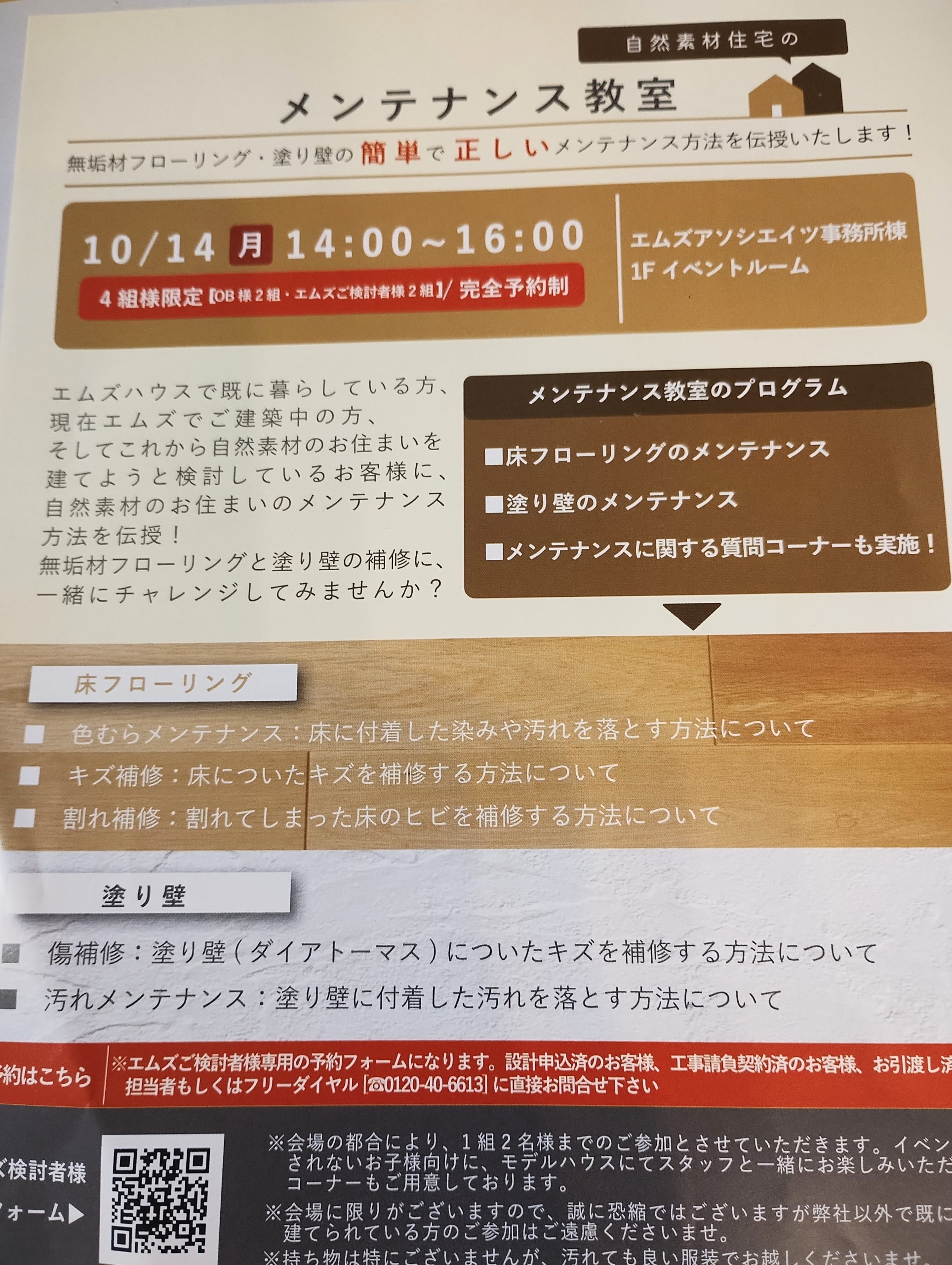 フローリングや塗り壁のメンテナンス教室なんて、、、かなり聞きたい内容です。