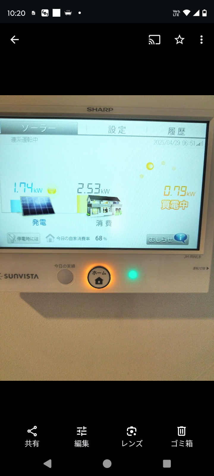 4月になり、晴れている日は、早い時間帯から売電ができているのですが、エコキュートの沸き上げが始まると、一気に買電に変わります。