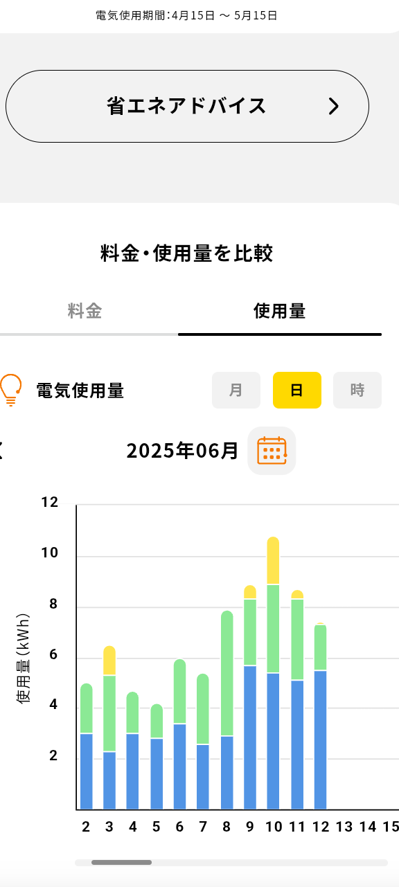エアコンを使った日は多少電力が上がっていますが、エアコンを使った日よりも、雨だった10日の電力が上です。