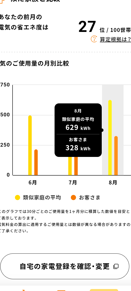 そして100世帯中の順位は27位。8月は電気代が増える家庭が多いんだなぁ。