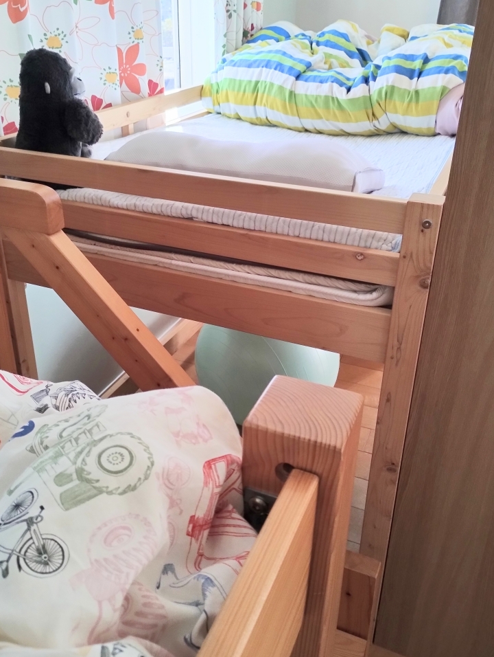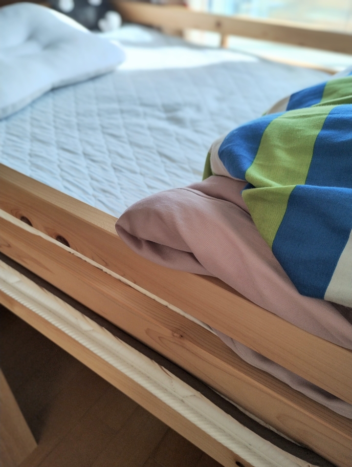 壁際に置いたベッドですが、窓を開けるとちょうど布団に日差しがあたり、布団干しまではいきませんが、いい感じです。