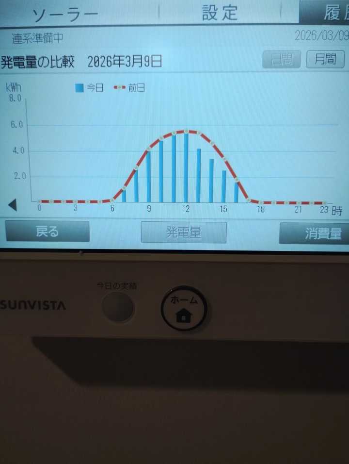赤い線が昨日の発電、今日は青いグラフの方です。