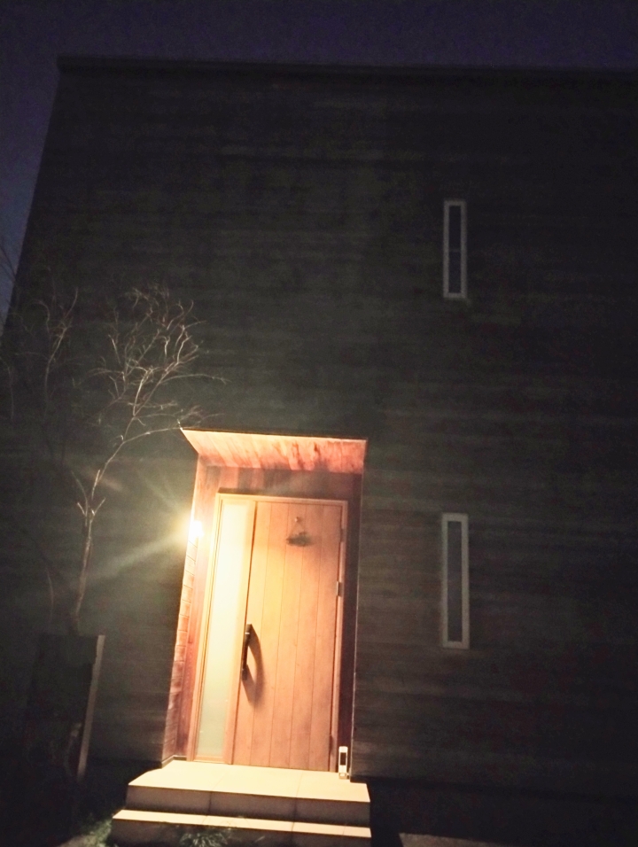 夜になると白い窓枠が目立つのでなかなかいいなぁ。