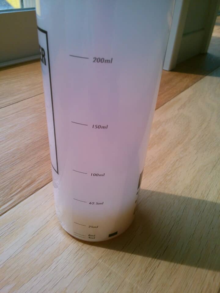 ちなみに、私は松原社長のブログを参考にワックス対水は1対3で作って計100ml作りました。一階の玄関、廊下を除く、LDKの床だけをワックスがけし、残ったのは