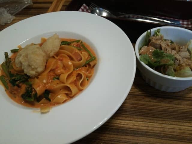 私はパスタを頼んで、友達はル・クルーゼのハンバーグにしました。