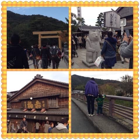 今日は伊勢神宮へお参りにっ!ただし、行きから渋滞で4時間もかかりました(T ^ T)先行き不安な感じで予定よりもかなり遅く伊勢神宮へ到着!無事お参りをして、楽しみにしていたおかげ横丁での食べ歩きっ♡たこ天、コロッケ、おもち、フグのからあげ、アイスっ♡(>_<)♡あっ!ひとつも写真ない…(~_~;)全部おいしかったですよ(笑)もちろんおみやげは赤福☆大満足で帰路についたんですが…( ̄◇ ̄;)ガーン
