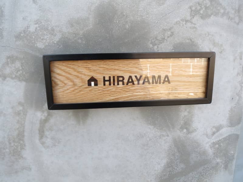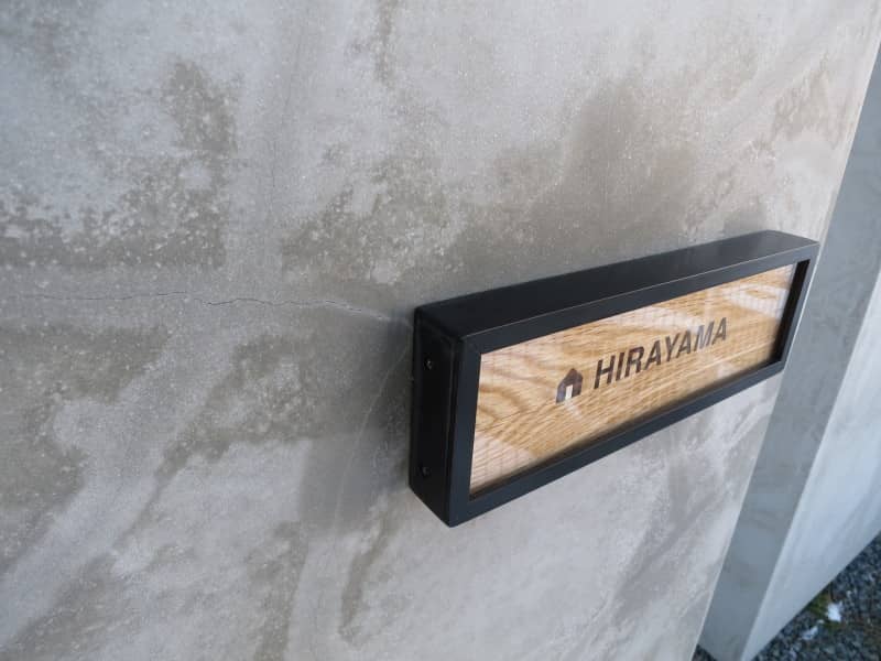 が枠はアクリル、表札部の無垢材加工はレーザーで削ってそこへ塗装するタイプでして、雨風当たる場所
