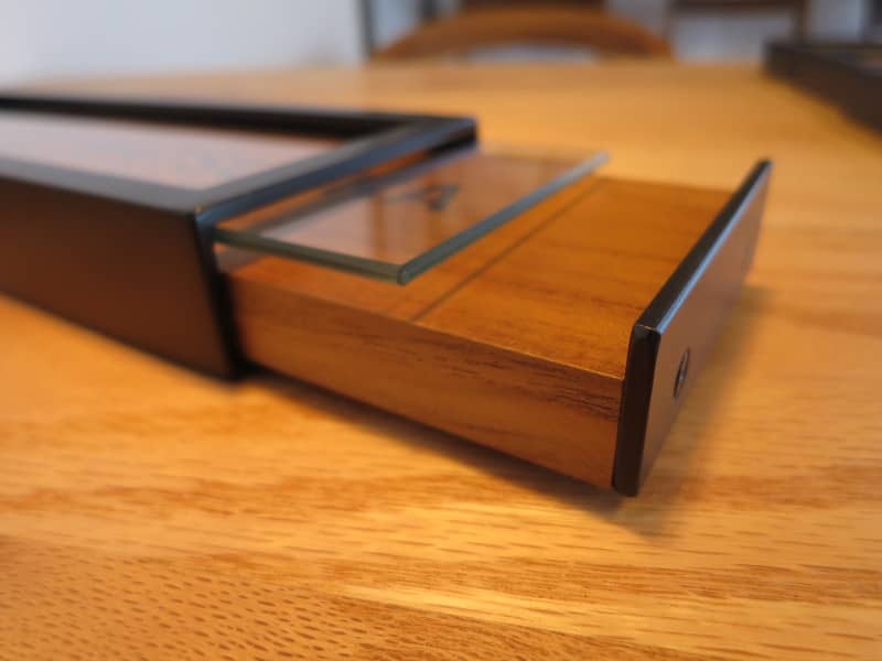 に別の木(エボニー)を嵌め込む加工です。木象嵌の加工を施した木部(ナラ)が鉄枠に納まるオリジナル