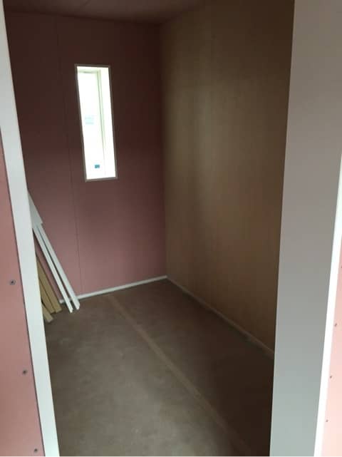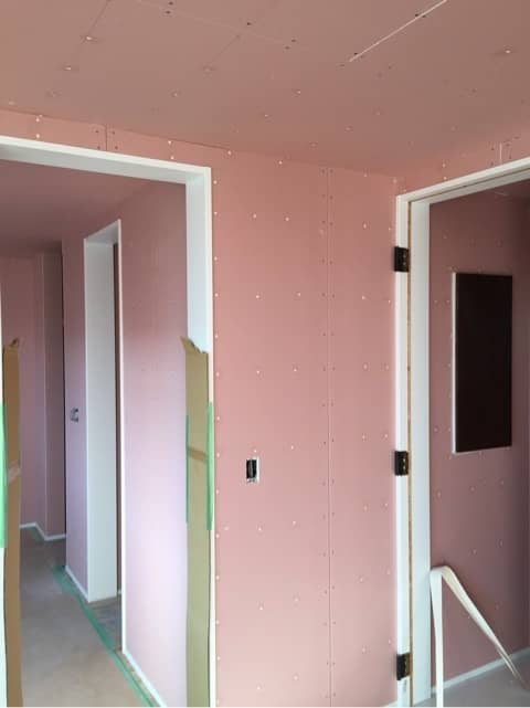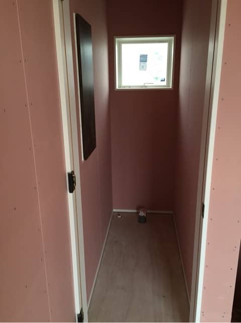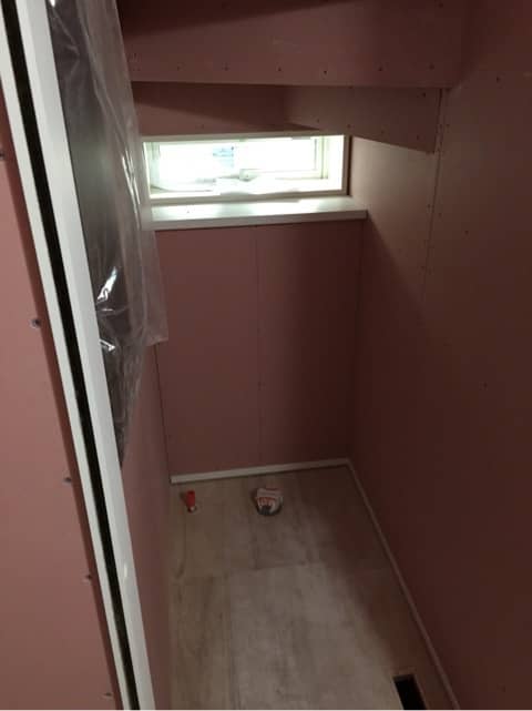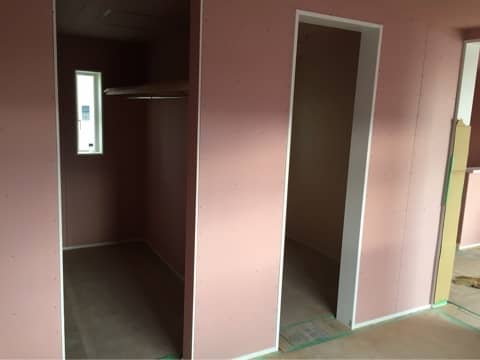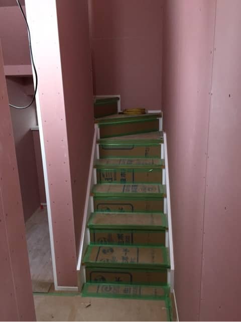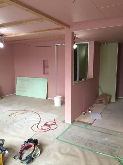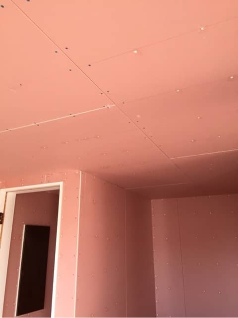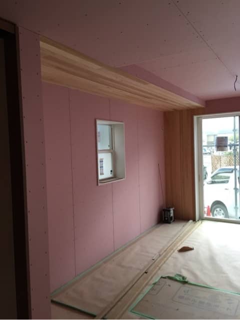 この写真は先週とりましたが現在はピンクのボードの釘穴、ボードとボードの繋ぎ目がしっかりと塞り塗り壁の下準備がされております。