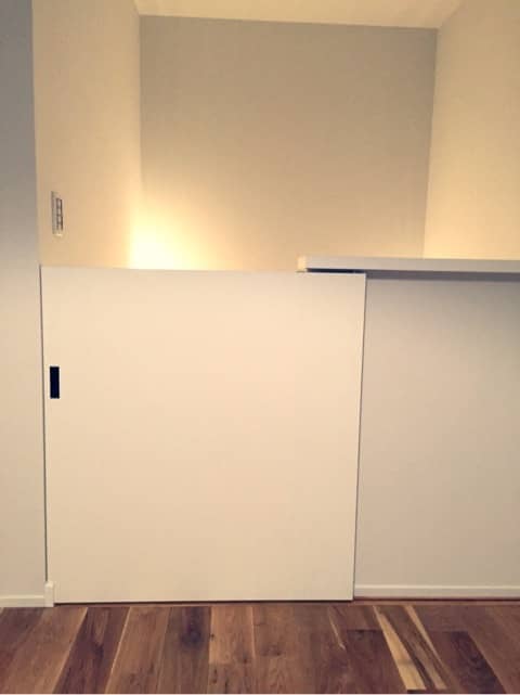 これは2階のホールの空調が階段下に逃げないよう、またおチビが勝手に下へ行かないようにゲートとしての機能もあるのですが、あっさり簡単に開け閉め出来てしまう‥‥。