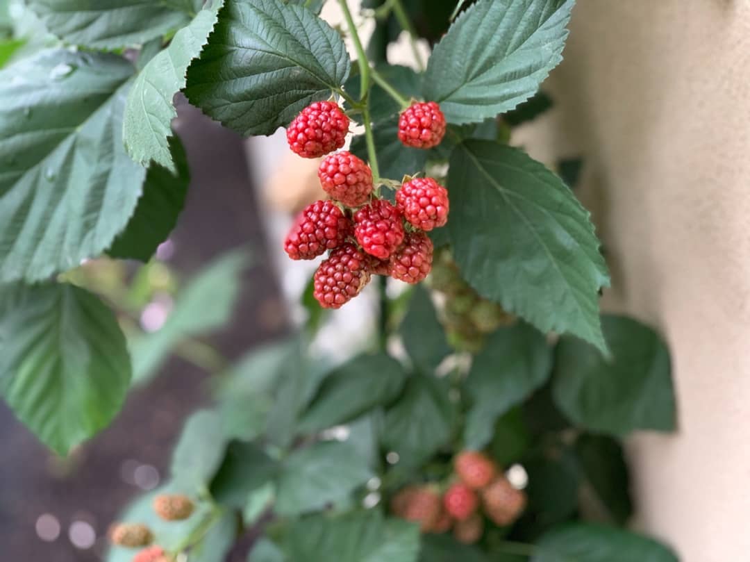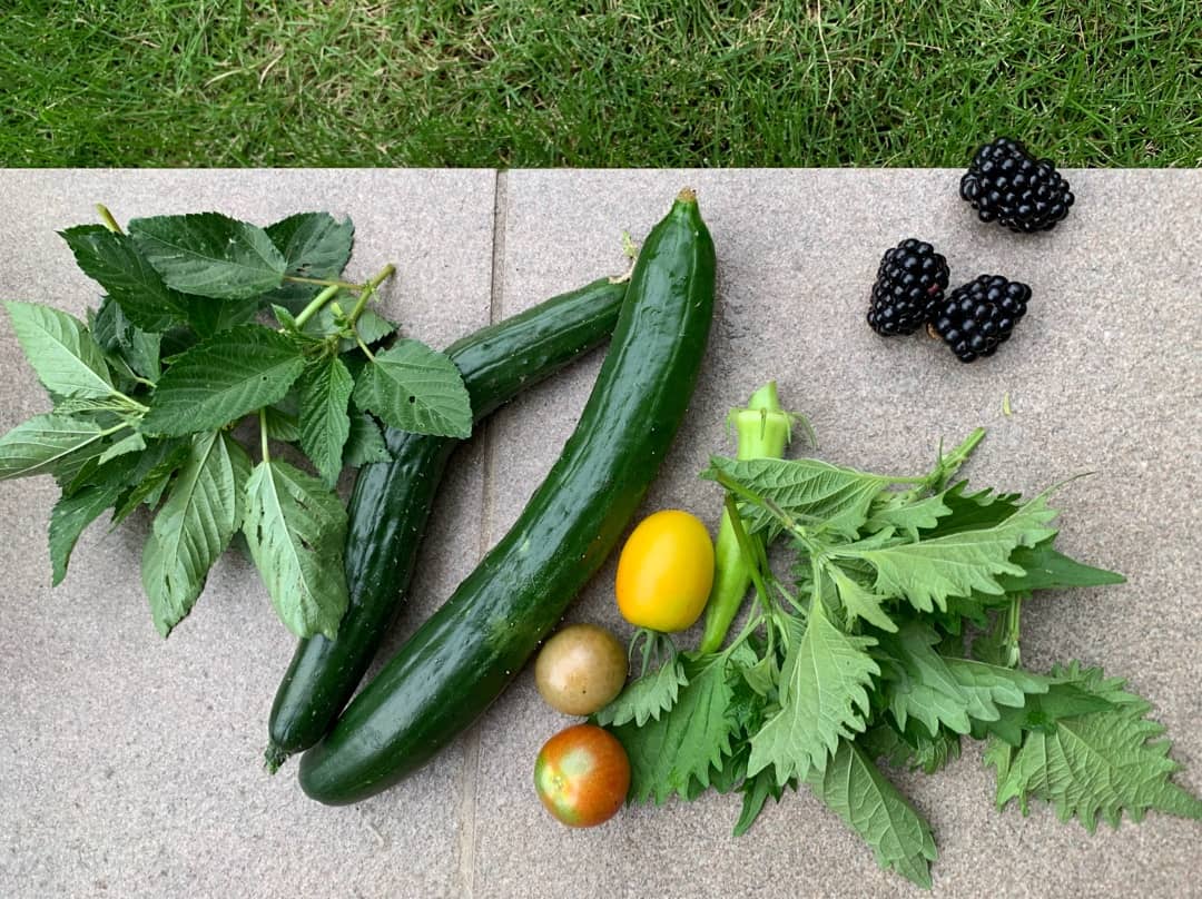 モロヘイヤ、キュウリ、ミニトマト、オクラ、青じそ、ブラックベリー。