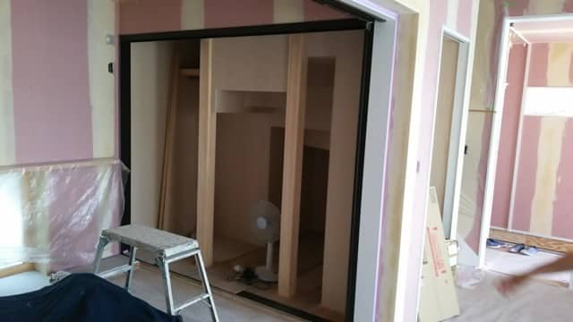 現在の我が家は、天井や壁の吹き付け作業に入るため、パテ埋め(ボードとボードの隙間や釘が目立たないように埋めてやすりをかける作業)をしている途中でした。