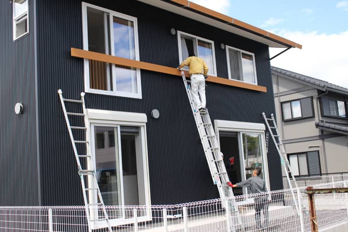 3人がかりで、大きなハシゴでの作業。