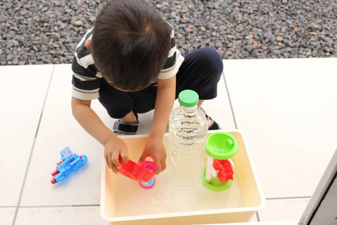 帰ってきた後は、お庭で水遊びが定番になりつつあります。