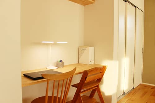 リビングのカウンターを勉強できるスタイルに変更しました。手元ライトも買いました。私もここでPC作業をすることが多いので、並んで使えるようにと。いすはダイニングテーブルと兼用で。使う時だけくるっと後ろへ持っていきます。