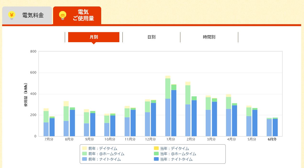 次に、電気の使用量。薄くて見えにくいですが、設置前の前年度分は、デイタイム(一番料金が高い時間帯)とホームタイム(二番目に料金が高い時間帯)の使用量が半分を占める月が1年の中で数カ月ありますが、蓄電池を設置してからは、夜中に貯めた深夜電力を、太陽光発電をしない天気の日のデイタイムやホームタイムに回せていることが分かります。電気の使用量自体はそんなに変わらなくとも、太陽光発電と蓄電池が頑張ってくれているので、青色部分のナイトタイムの比率が大きくなっています。