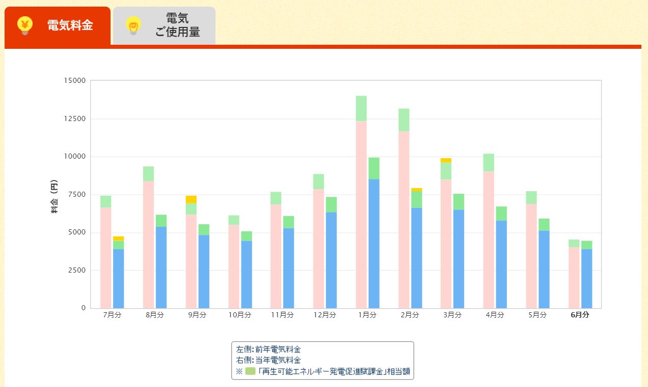 ピンク色の棒グラフが前年度(太陽光と蓄電池設置前)、青色の棒グラフが設置後です。グラフを見ると、冷暖房を使う季節の電気料金がググっと下がっています。