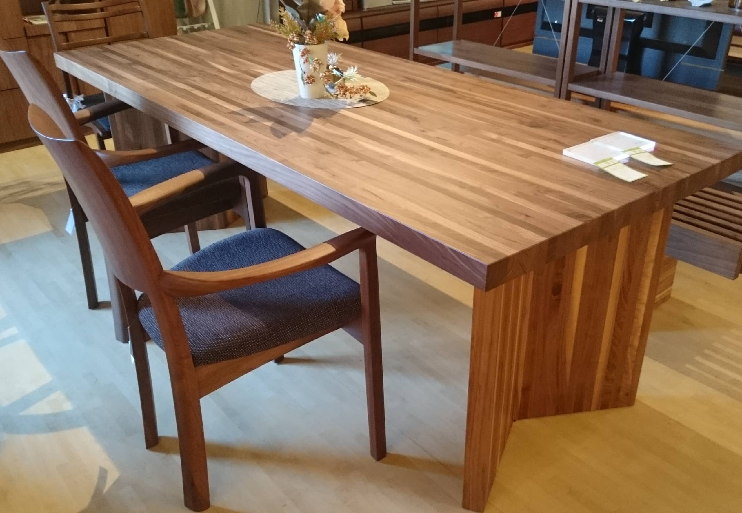 テーブルとイスは無垢材にしようとは思ってたんですが、床材と同じように木材の種類によって色味が違うので、色々なお店を見て廻りました。![]()