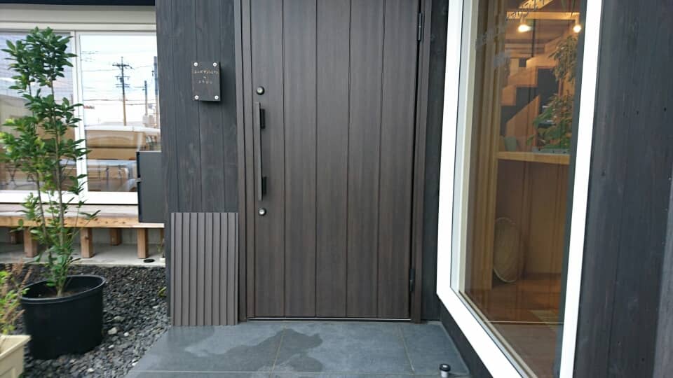 玄関ドアを明るくするとアクセントの木とケンカするんじゃないかなと思い、思いきって桑炭に。