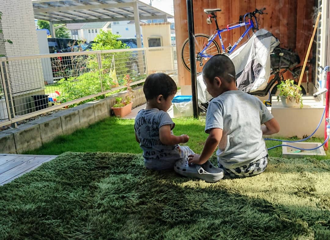 ちょっと前の写真ですが、じゅうたんをウッドデッキに干していると子供達もじゅうたんの上でゴロゴロ。とても開放的でウッドデッ