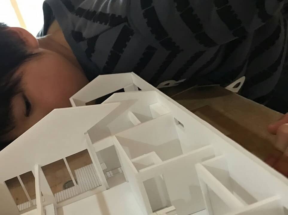 桜がきれいですねぇ 先週 電気の打合せをしました。 設計のときの電気打合せでは 図面を見ながら説明していただき ふむふむと思っていましたが、 実際に家で一室ずつ 照明やスイッチ、コンセントの位置や数を説明してもらいながら確認すると、 ここにもコンセントあった方がいいな とか 将来的にはテレビこっちにくるかも とか いろいろ出てきて、 たくさん変更や追加をお願いしてしまいました。 表札の話も出て どんな表札を選んだか記憶になくて 高木さんに確認していただいたところ 我が家、 色打合せの後で外壁の色を変更しており 最終的に決めた外壁の色と同じような色の表札を選んでいたことが判明しました! 好きな色だから無意識に選んでしまうのか… あやうく保護色の表札になるところでした。笑 高木さんが我が家の模型を持ってきて下さっていて 息子は初模型でした♪