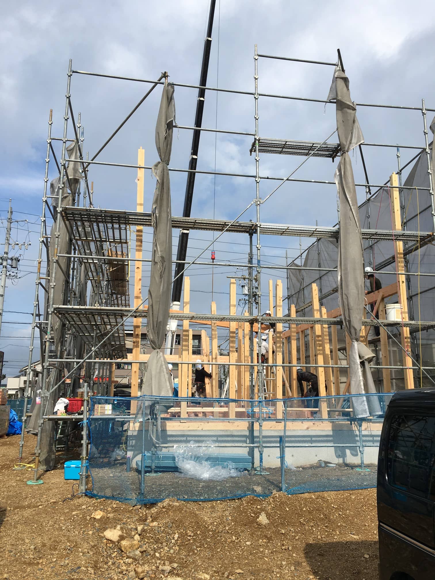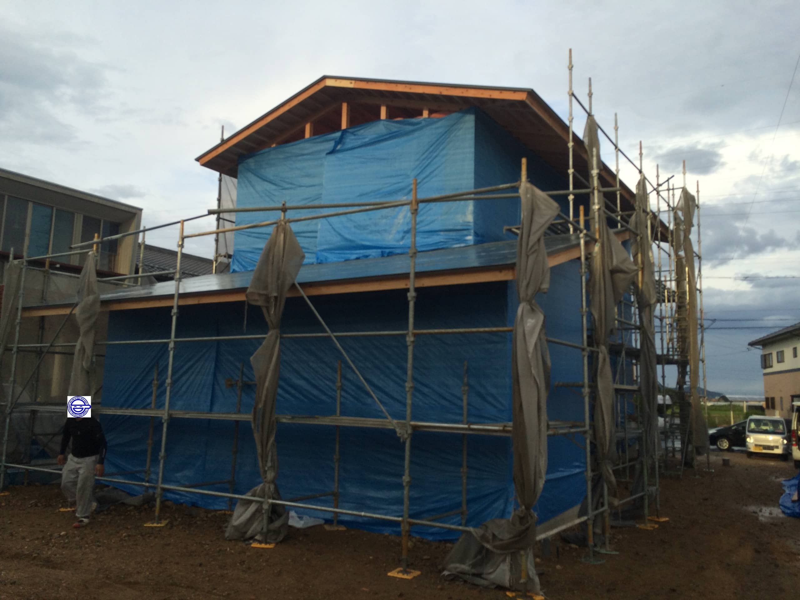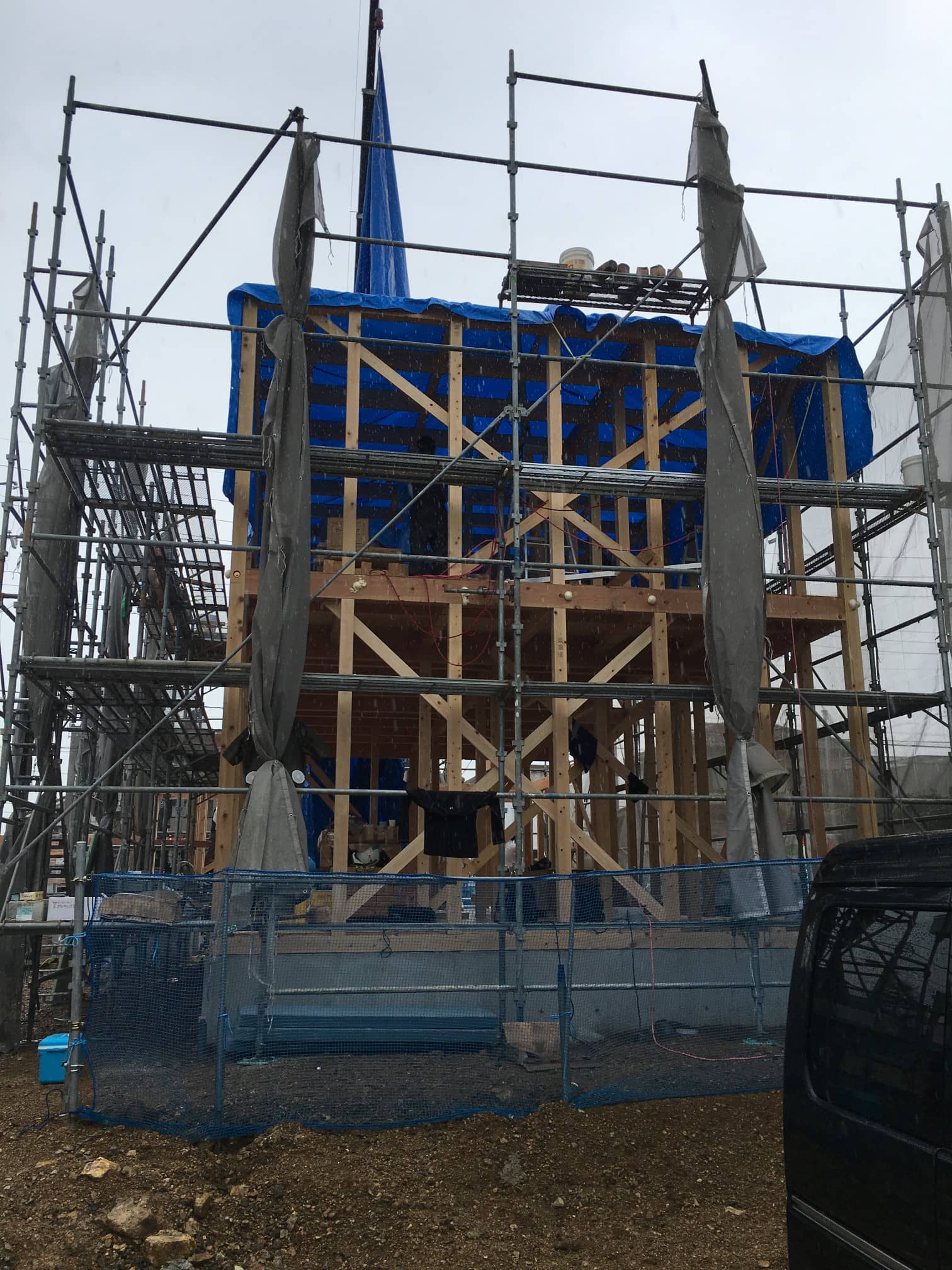 Kさんをはじめ、大工の方々が柱や床に雨が当たらないよう、ビニールシートをかけて一日作業に当たって下さいました。